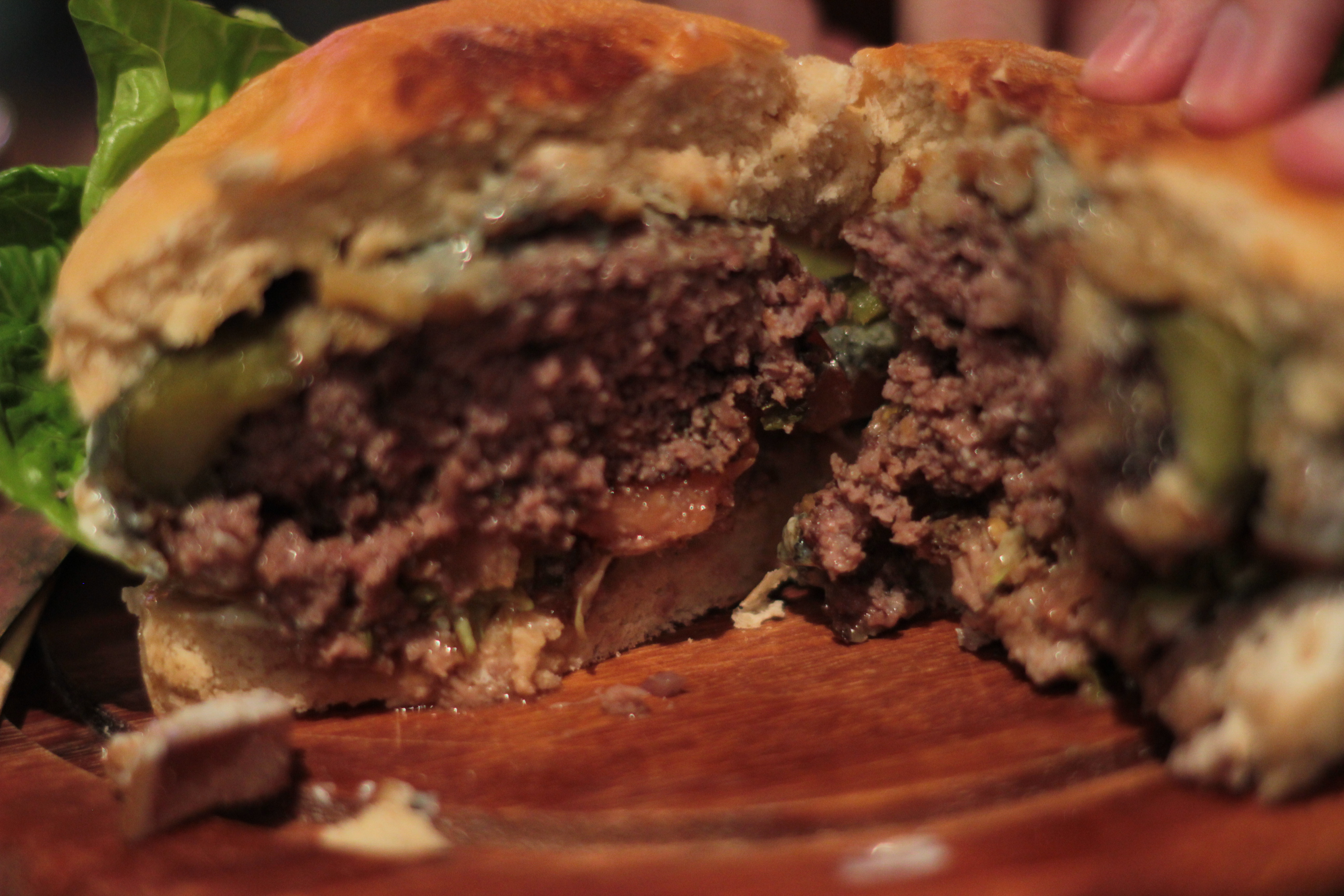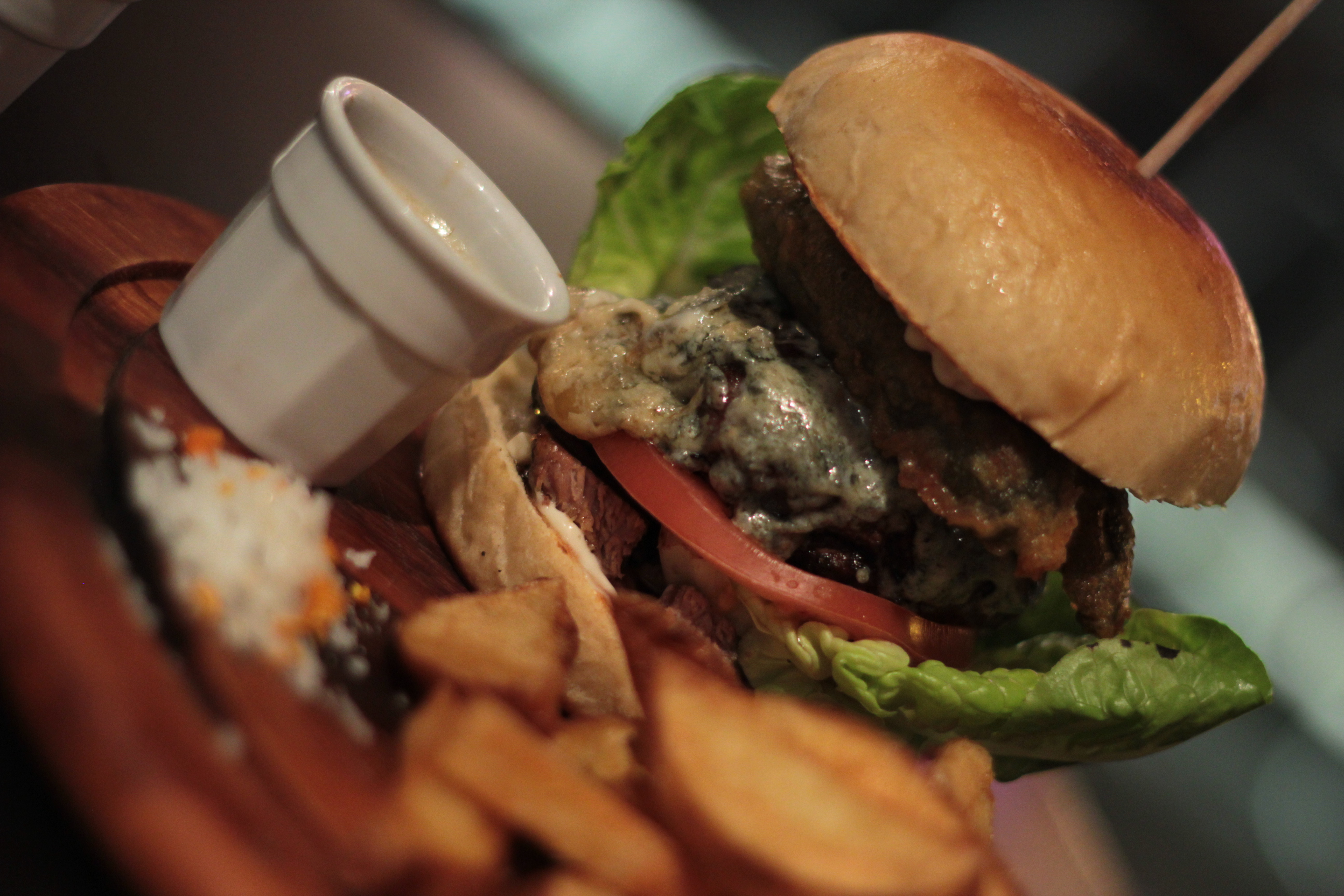 The ‘Behemoth’ burger, named after Polish metal band ‘Behemoth’ consists of a handmade beef patty topped with melted stilton on a slice of beef tomato with thick chunks of brisket, crispy little gem lettuce with deep fried dill pickes and a horseradish mayo. All of this is served up on a lightly toasted bun with a rich marrow gravy.