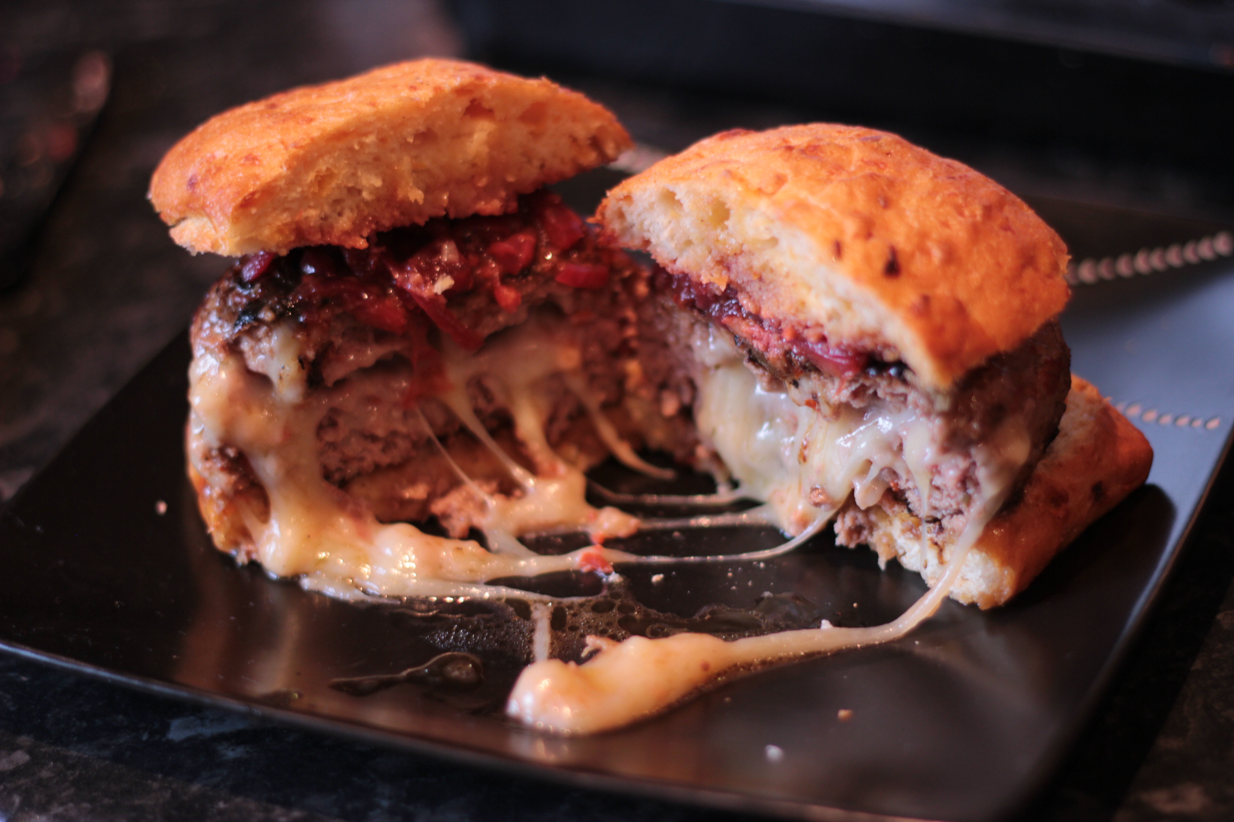 After recently being disappointed with the stuffed range at Handmade Burger Co (read the review here), we were left wondering if it was possible to actually create a stuffed burger that wouldn’t result in the contents found the middle evaporating during cooking. Our good friend @Astro_Pol (follow him on Twitter!) was up to the challenge and set about creating the best stuffed burger you are ever likely to try. We invited him to James vs. Burger HQ to show us how it’s done and as soon we took our first bite, we were in stuffed burger heaven. Following this recipe will result in the best stuffed burgers you’ll ever eat whether it’s in a restaurant or homemade.