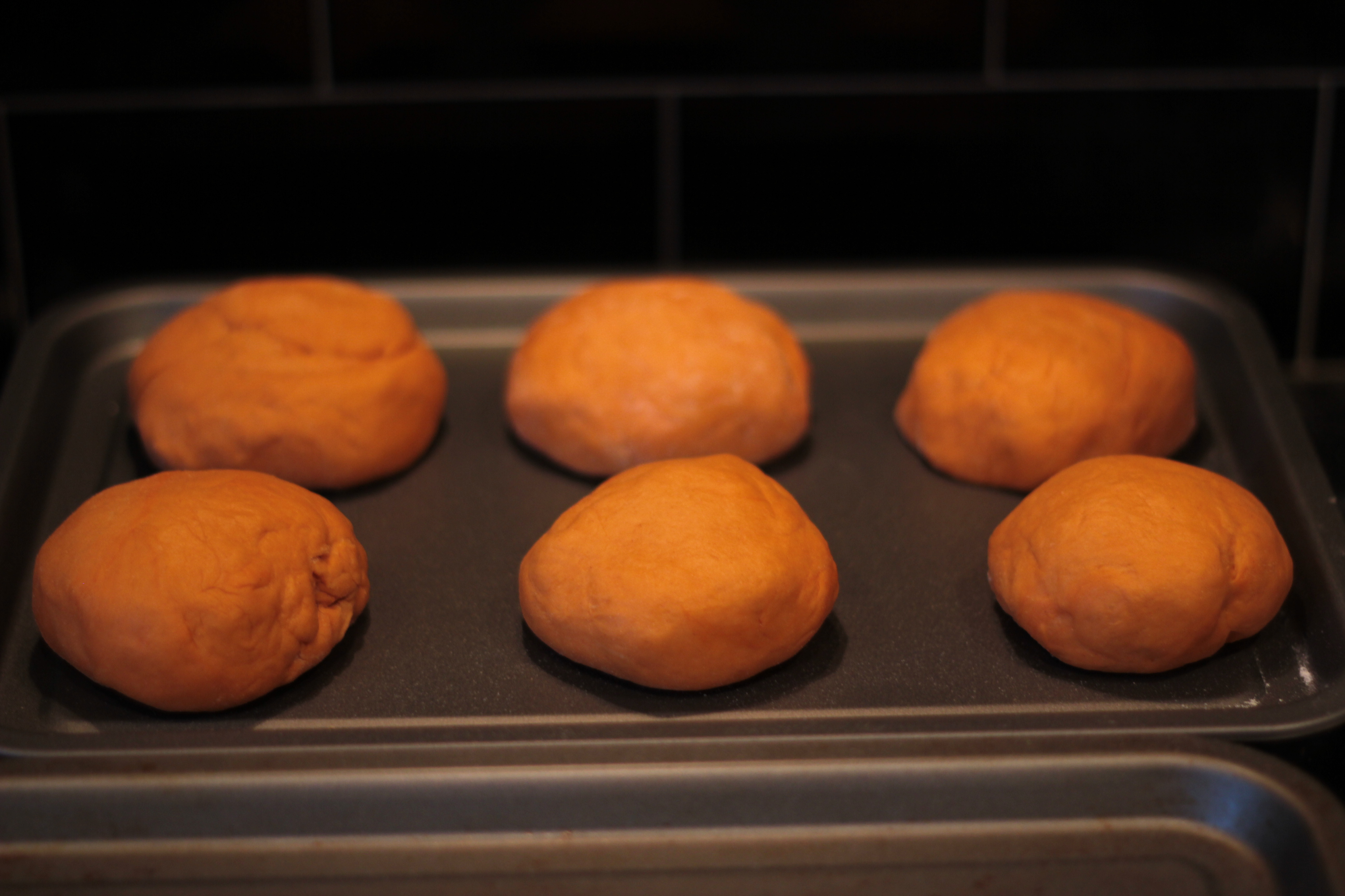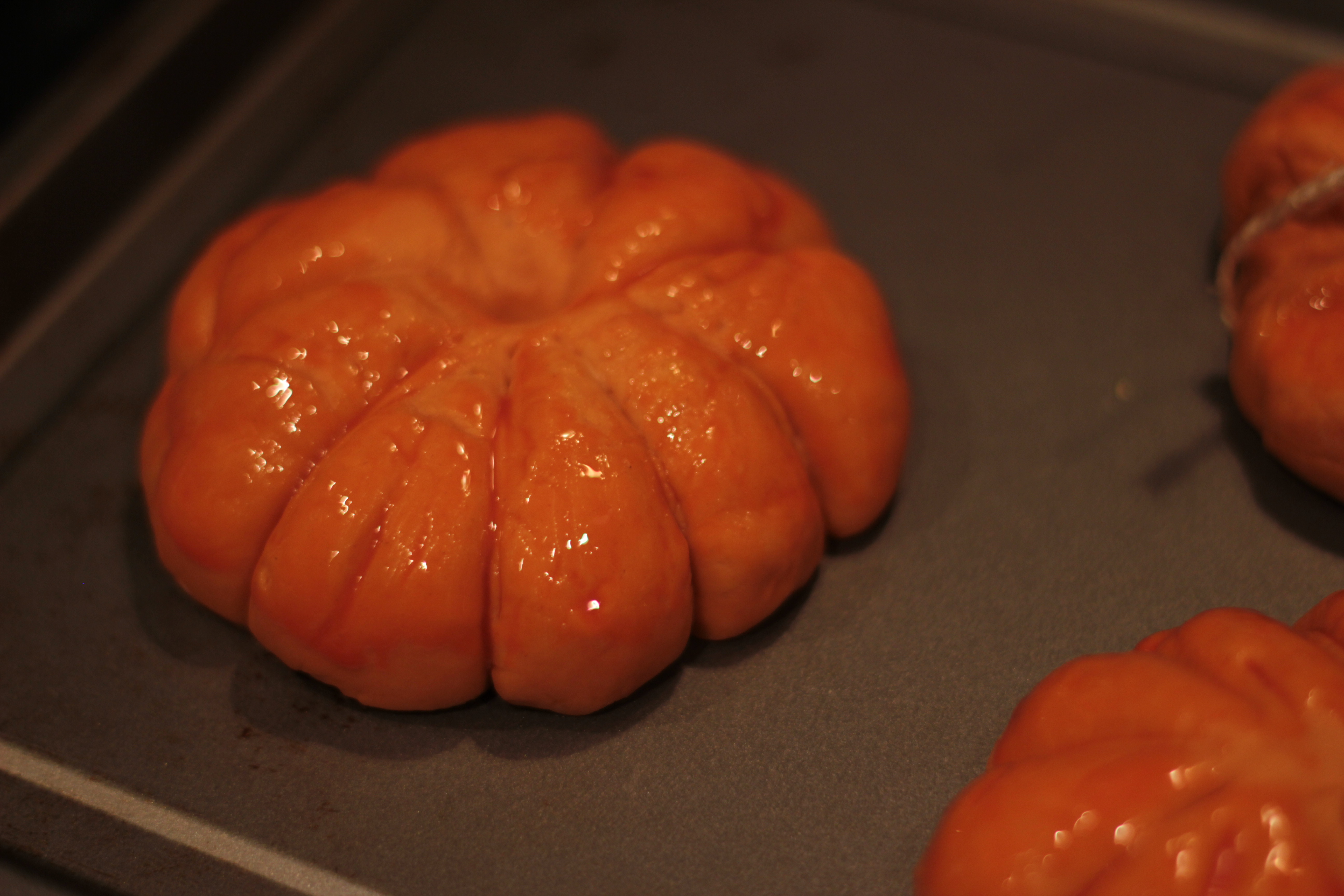 We then basted the buns with the egg yolk and water mix (added in some more orange dye for added effect)