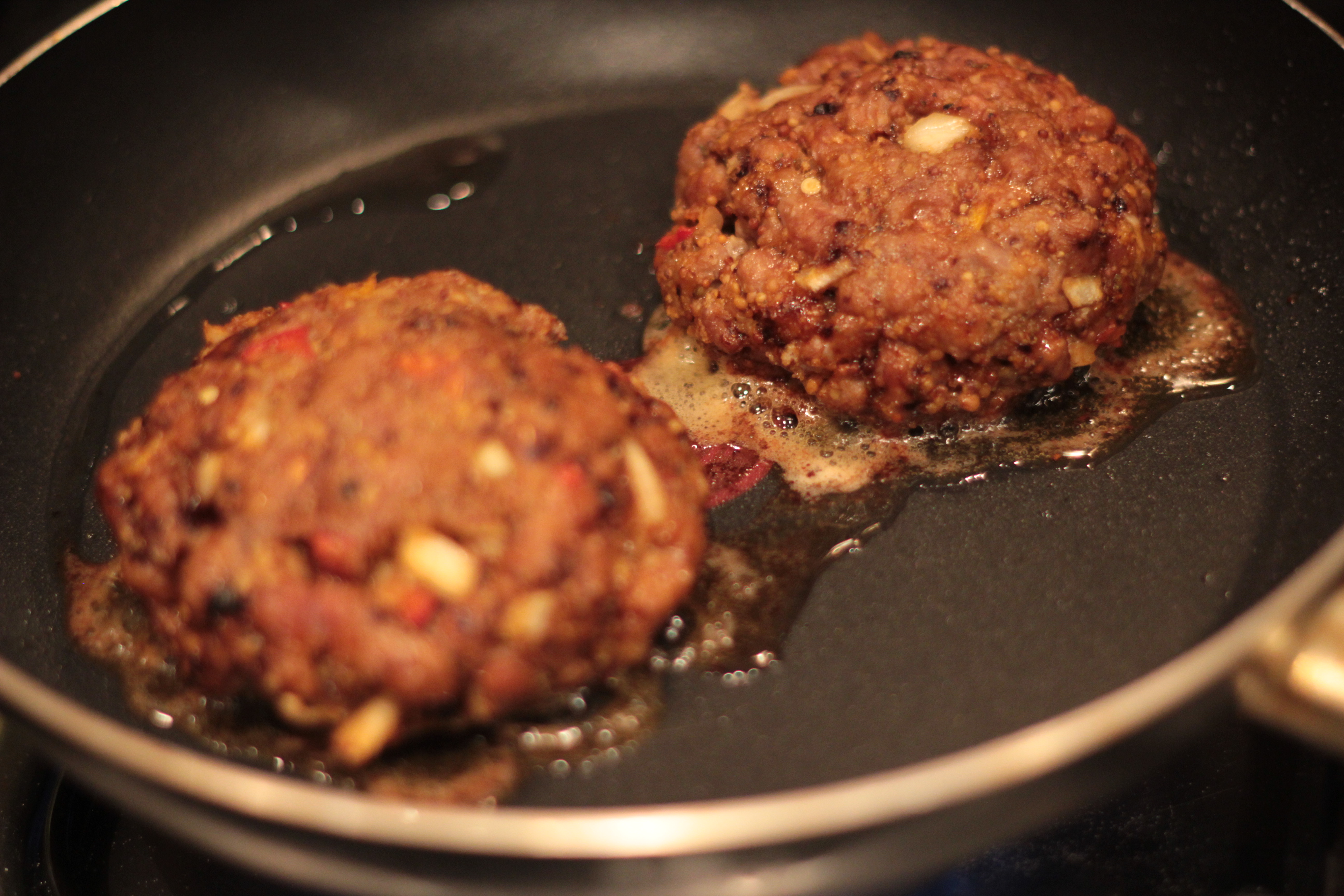 Next, heat up some oil in a pan and begin to cook your burgers ensuring to flip them every few minutes. The time it takes will vary depending on the size of the patties and how you like your burger cooked. Cook until the juices run clear and the meat is nicely browned on the outside.