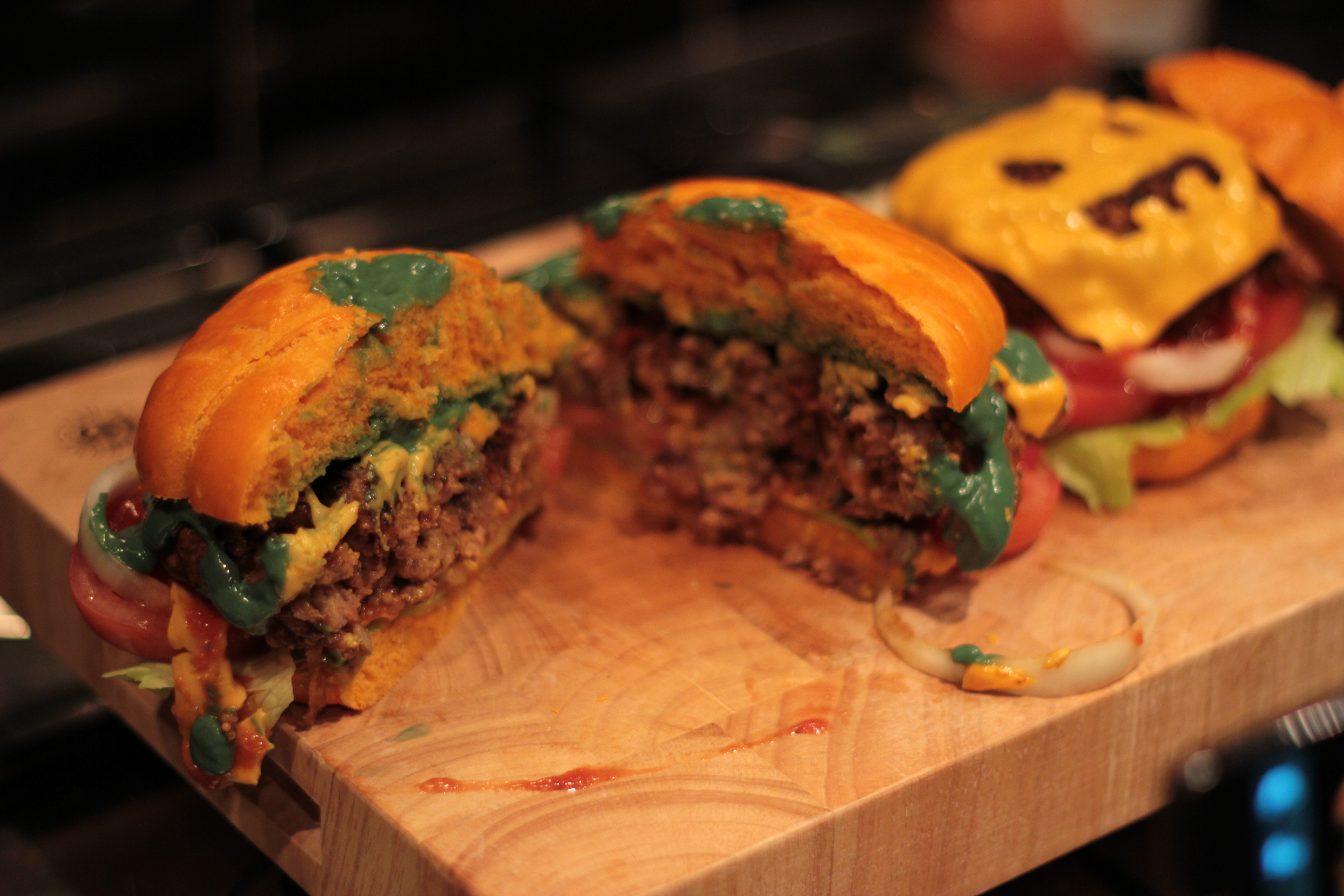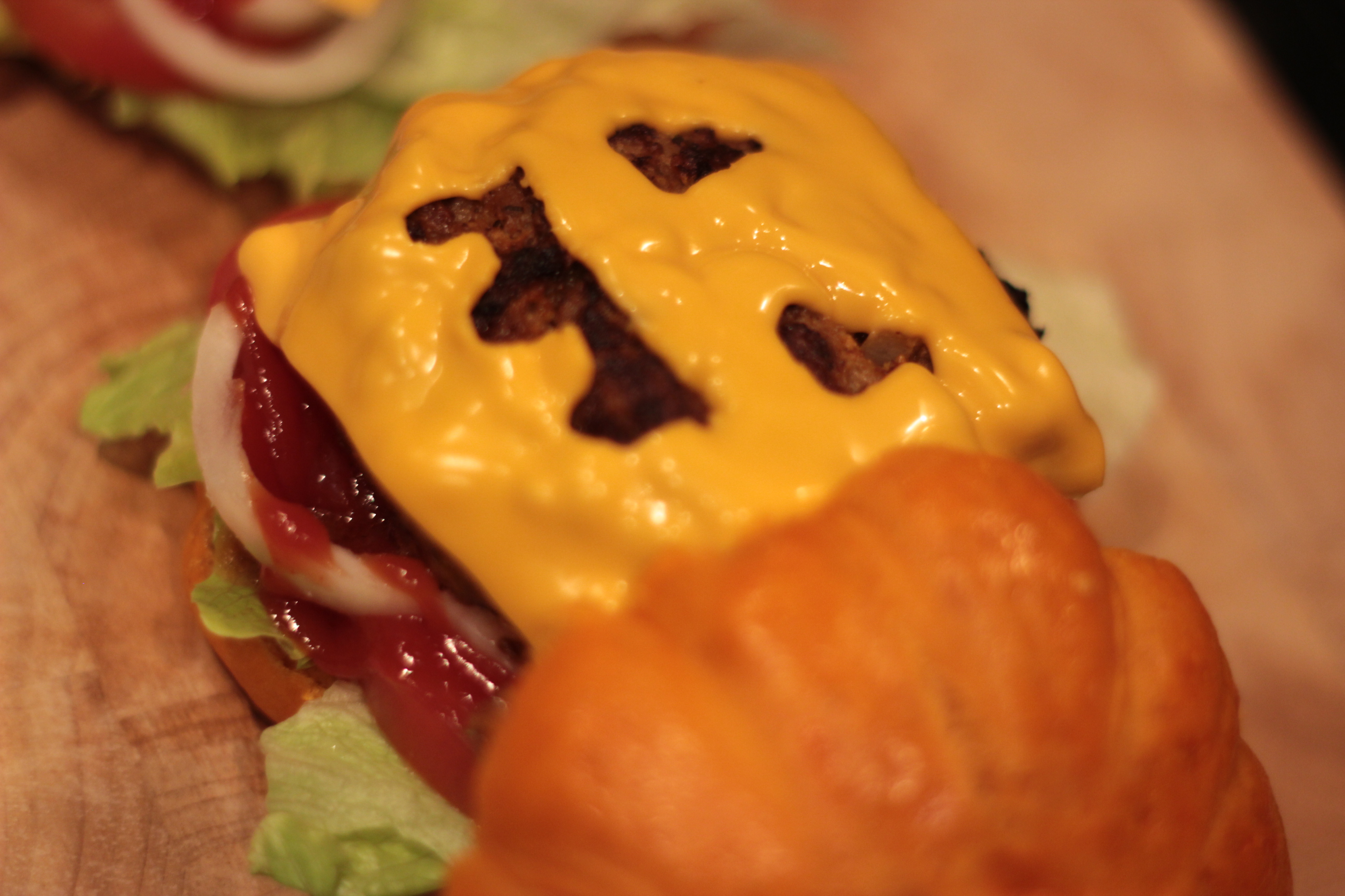 While your patty is cooking, it’s time to prepare the bun. Slice the buns in half and start with some lettuce, onions and tomato and ketchup and a slice of American cheese on the bottom. Once the burger is ready, place it on top. Take a sharp knife and cut a scary face into your other slice of American cheese and place it on top of the burger. Then, take your green mayo and spread it generously on the top half of the bun.