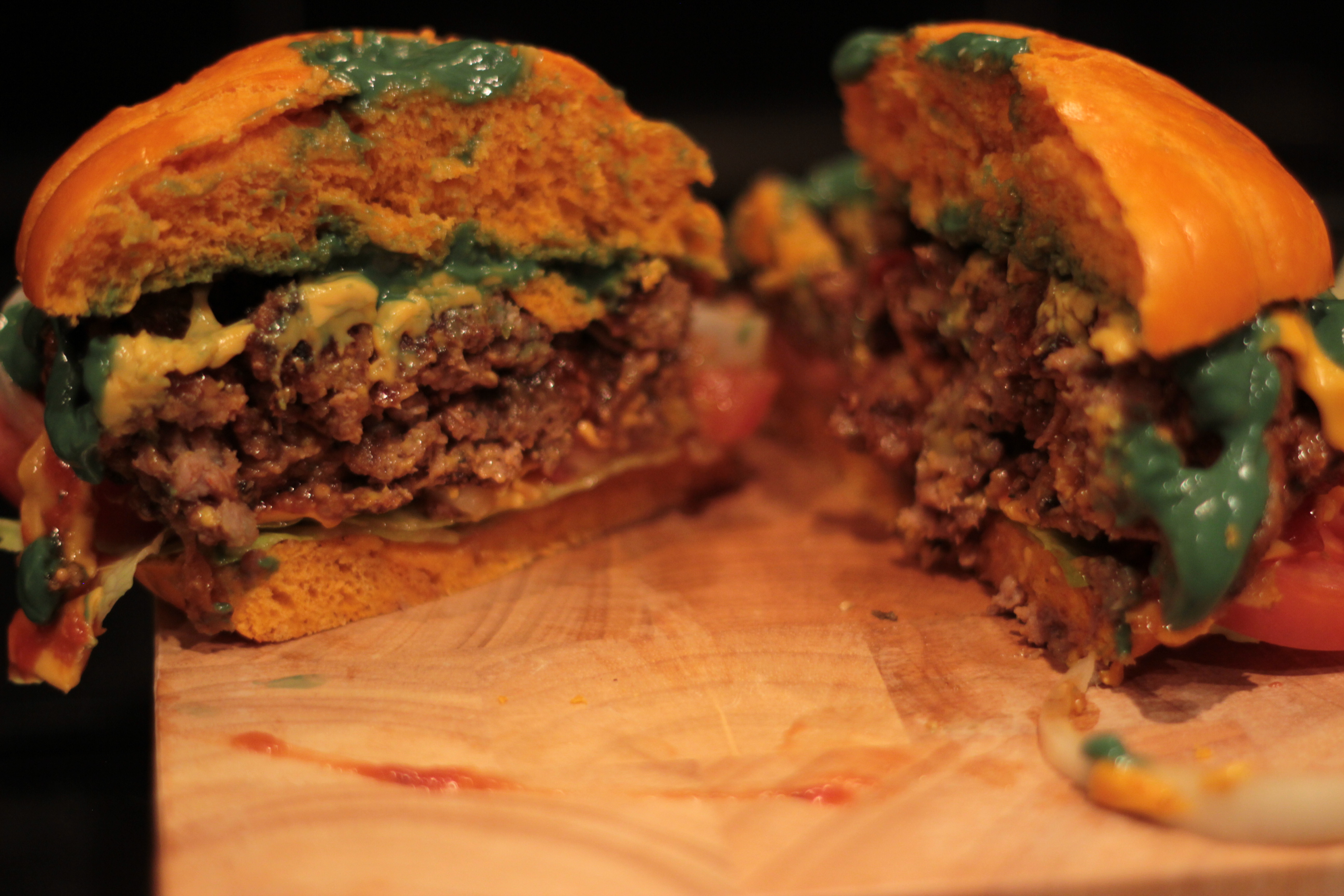We like to get creative here at James vs. Burger and since this year marks our first Halloween, we wanted to create some frightful delights to mark the occasion. We wanted to make this burger completely from scratch, right down to the bun itself; however, since it’s Halloween we thought we’d go a bit further and get creative with some food colouring too.