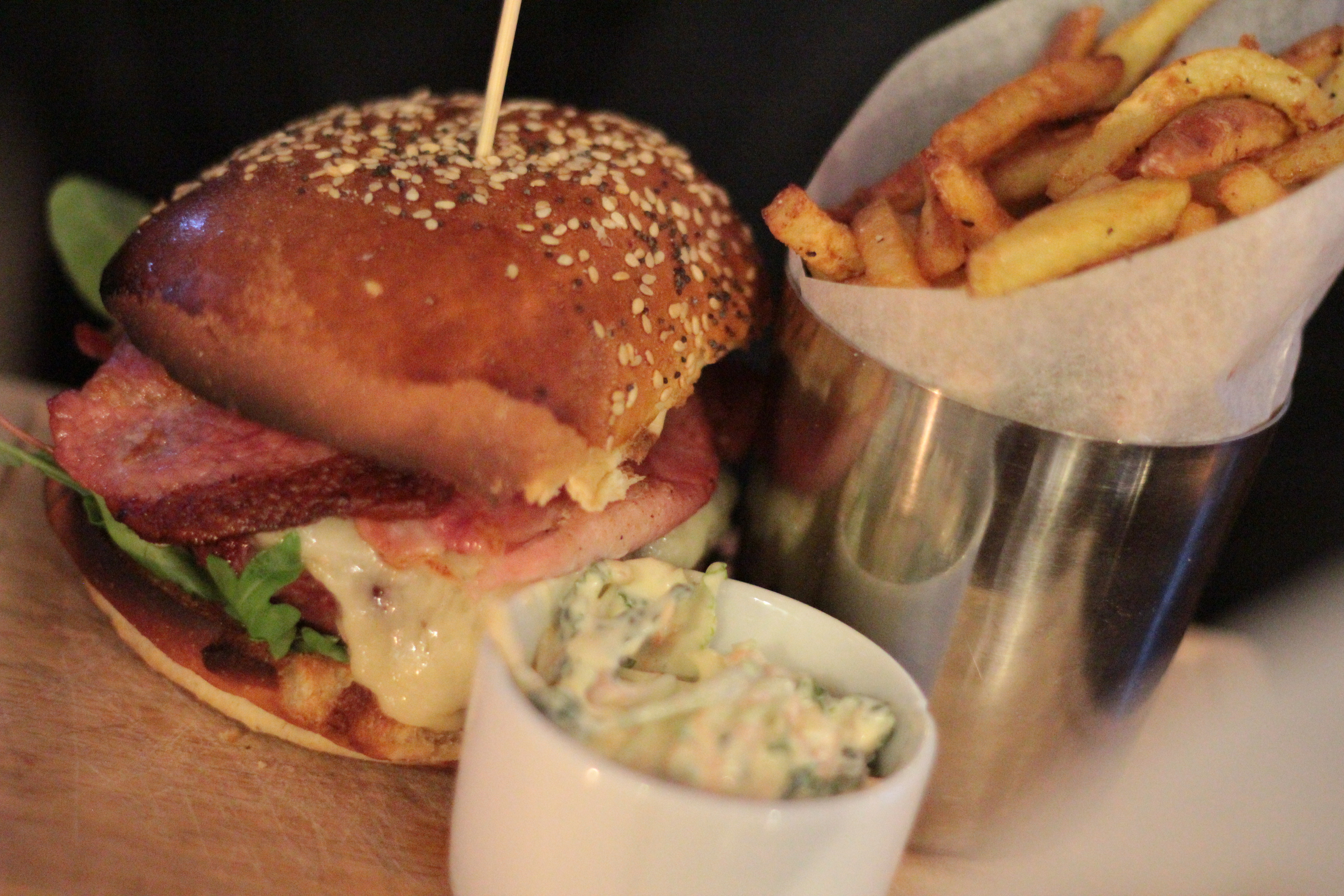 After a quick browse of the menu, we settled on the steak burger and the weekly special. The steak burger was topped with gruyere cheese, gherkins, tomato salsa and chipotle mayo and served on a toasted sesame bun. There was the option to add bacon for an extra £1.50 and despite being a little fed up with seeing bacon on just about every burger I’ve eaten recently, I decided to complete the experience and add it anyway. The weekly special consisted of a pork and chorizo patty topped with red pepper and garlic mayo, also on a toasted sesame bun. Both burgers came with a side of coleslaw and a portion of skinny fries.