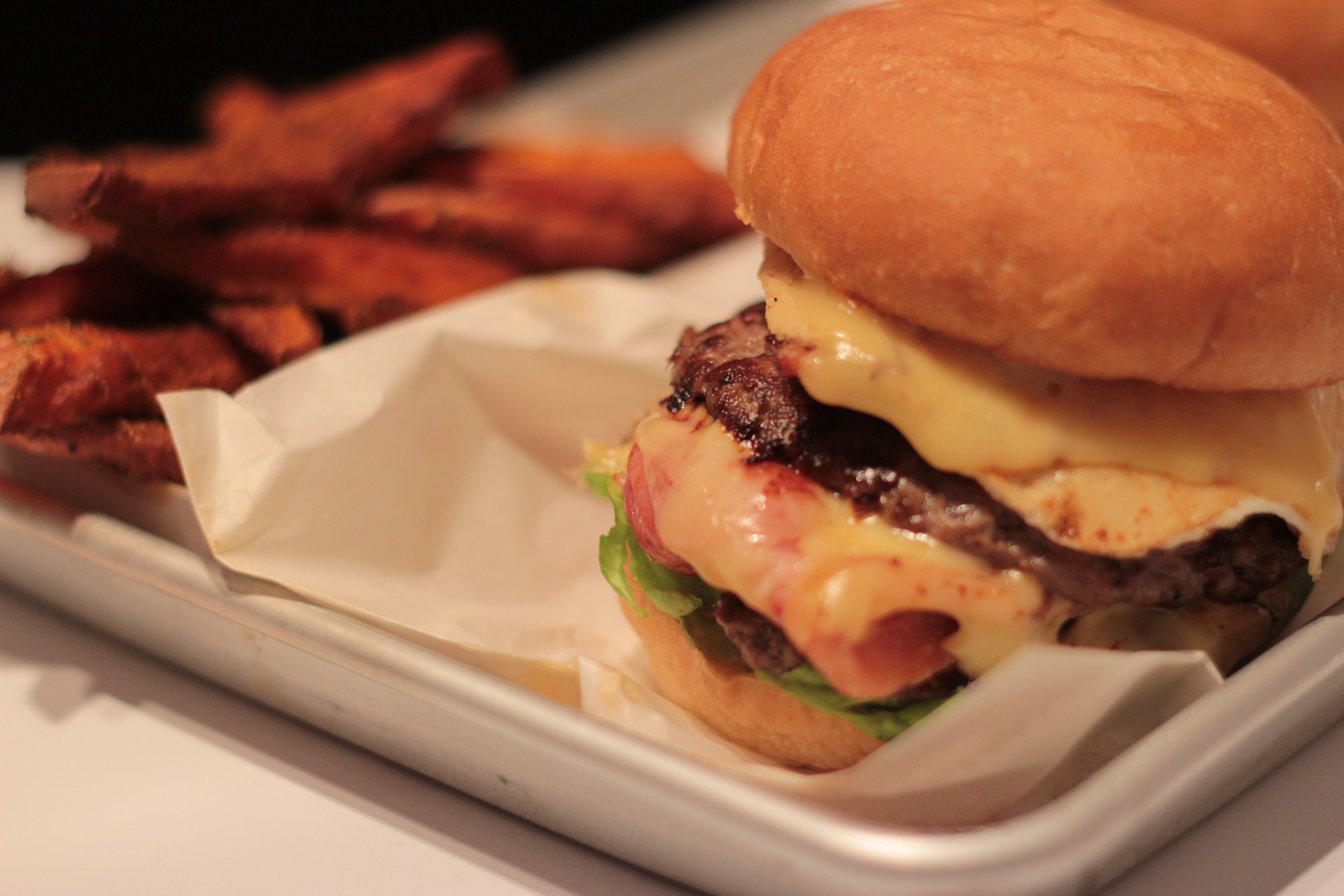 We opted for two double bacon cheeseburgers. We topped them with relish, grilled red onions (both free) and a fried egg (50p extra). As it was Superbowl Sunday, Wannaburger were running a special of Cajun sweet potato wedges, much to our delight. We love sweet potato fries and couldn’t pass up the oppertunity to order a couple of portions to go along with our burgers.