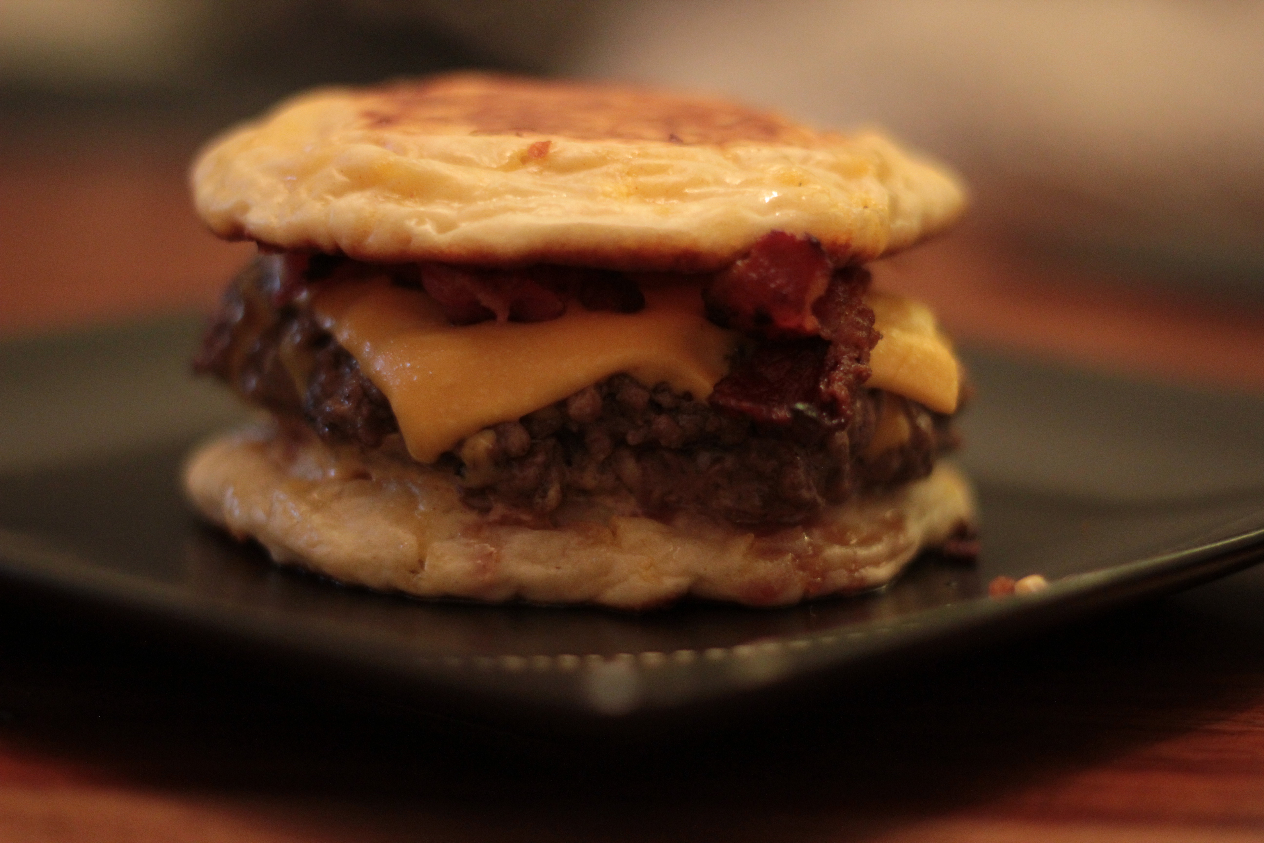 Now simply plate up, slicing the bacon and placing it on top of the patty before topping with the second pancake.