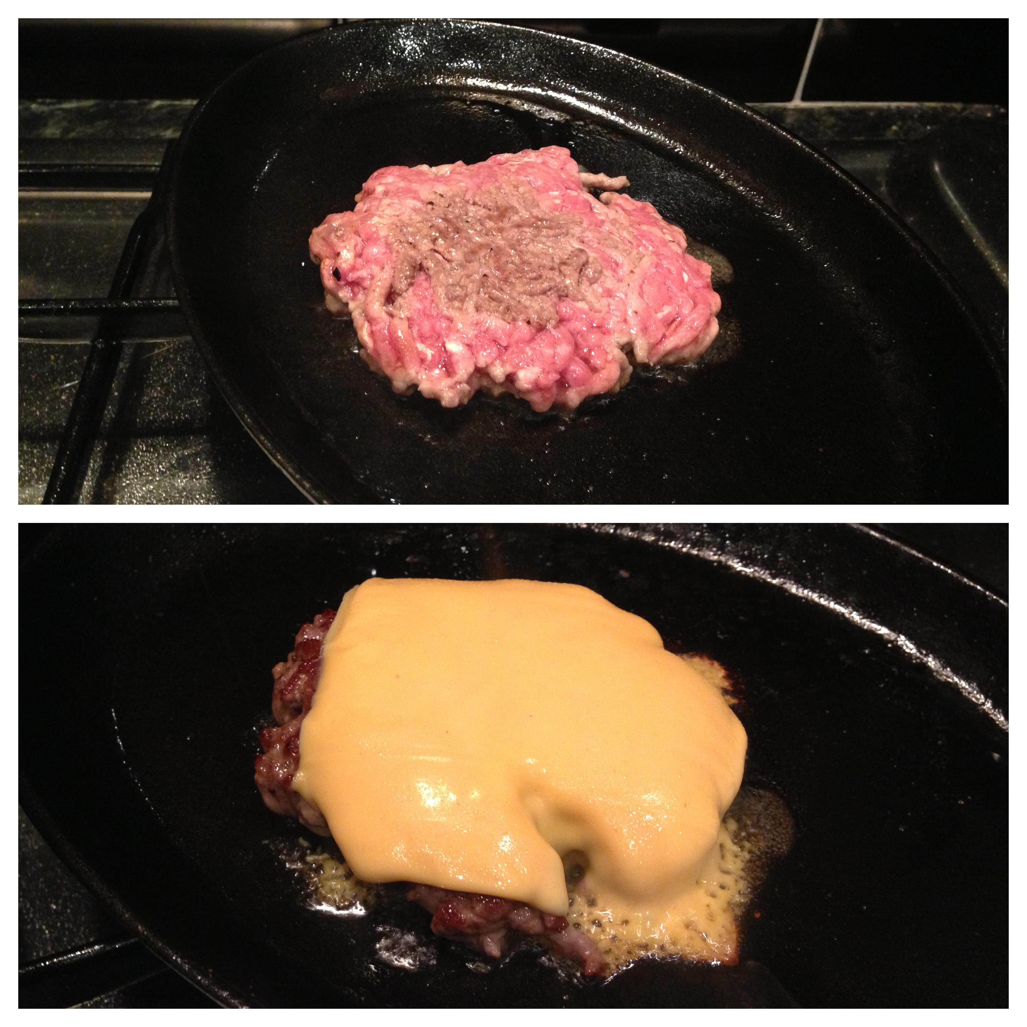 Sprinkle salt on the top side only. Place the ball of meat into the hot pan (salt side down). Cook for one minute.