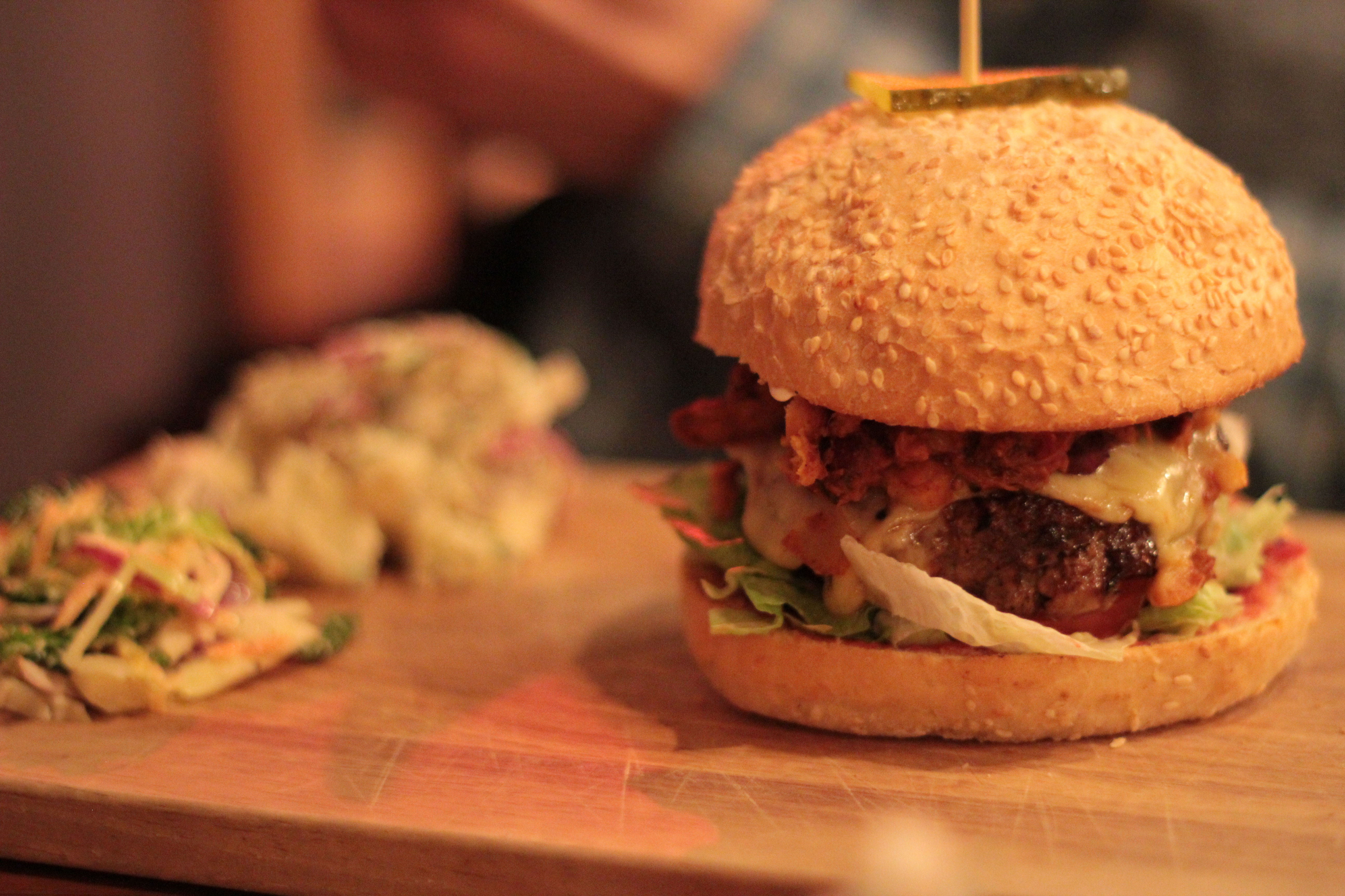 We won’t go into all of the details about the bar itself. For that, you can check out our previous review (just ignore the camera phone photos!). The menu hasn’t changed since our visit last year and the focus is still on burgers and pizzas. The selection is kept fairly small. There’s simply a beef burger or a veggie option along with a nice range of toppings to choose from. We opted for two beef burgers – one topped with pulled pork chilli and cheddar and the other with bacon, smoked brie and red onion chutney.