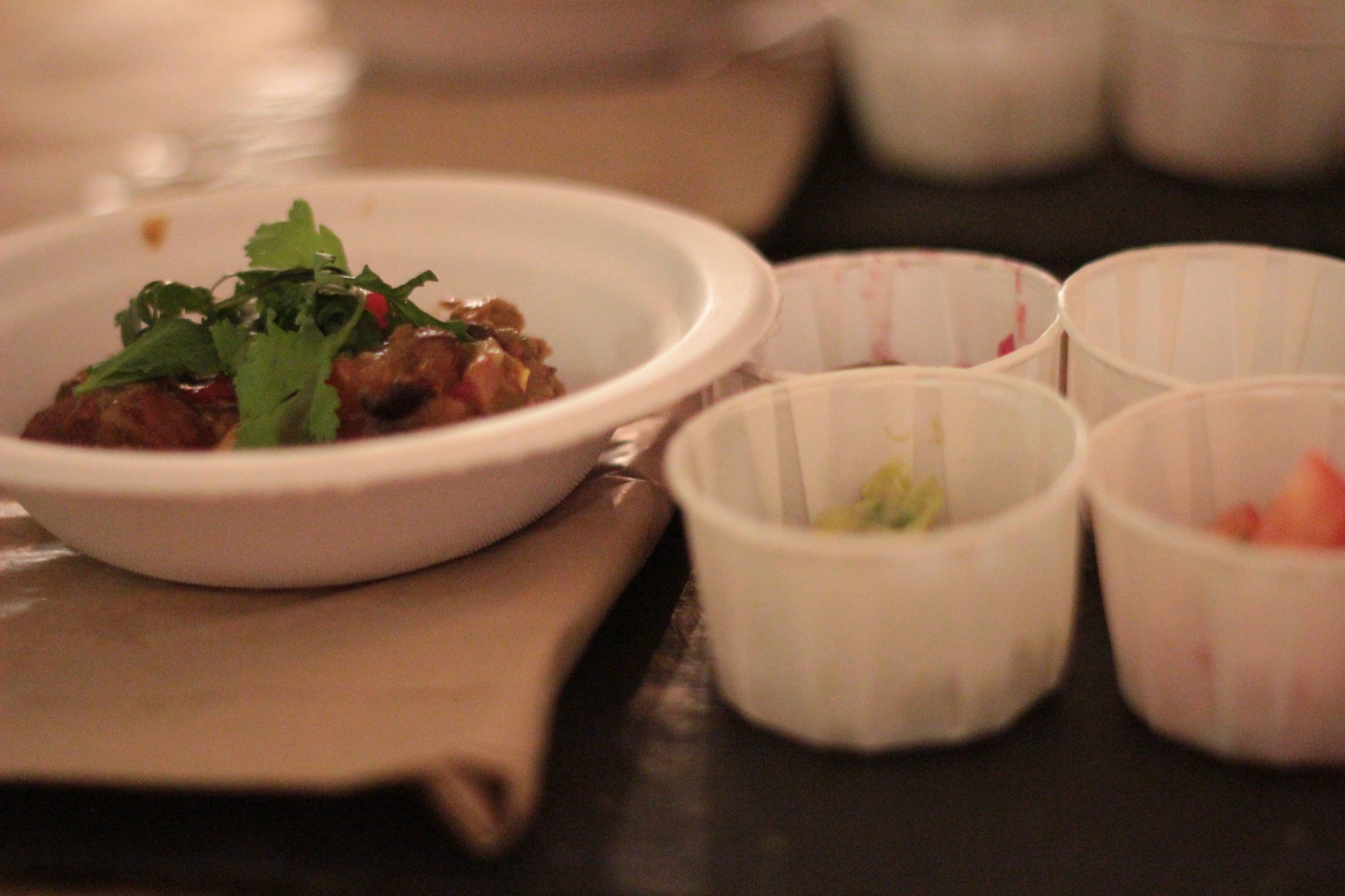 Lupe Pinto’s dishes consisted largely of different types of chilli and the first one we tasted was the ‘Lupe’s famous beef, chorizo and chipotle chilli’. This had a nice, smokey flavour with a healthy, spicy kick which was enough to make me appreciate the accompaniments served with the dish. On the side were paper dishes filled with sour cream, guacamole, jalapeños and sweet onions. Each chilli also came with a serving of wraps for you to build your own creation – a very nice touch.