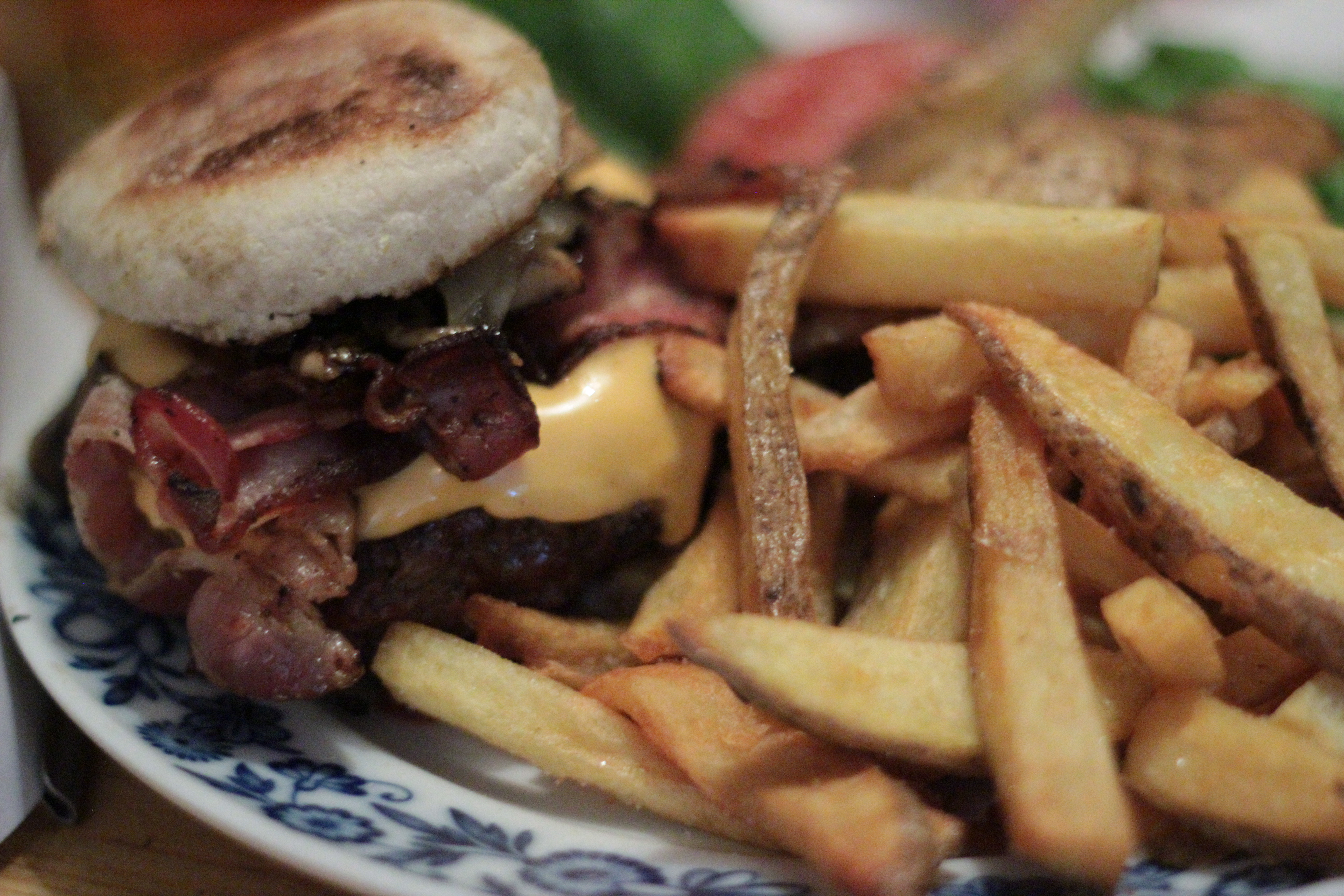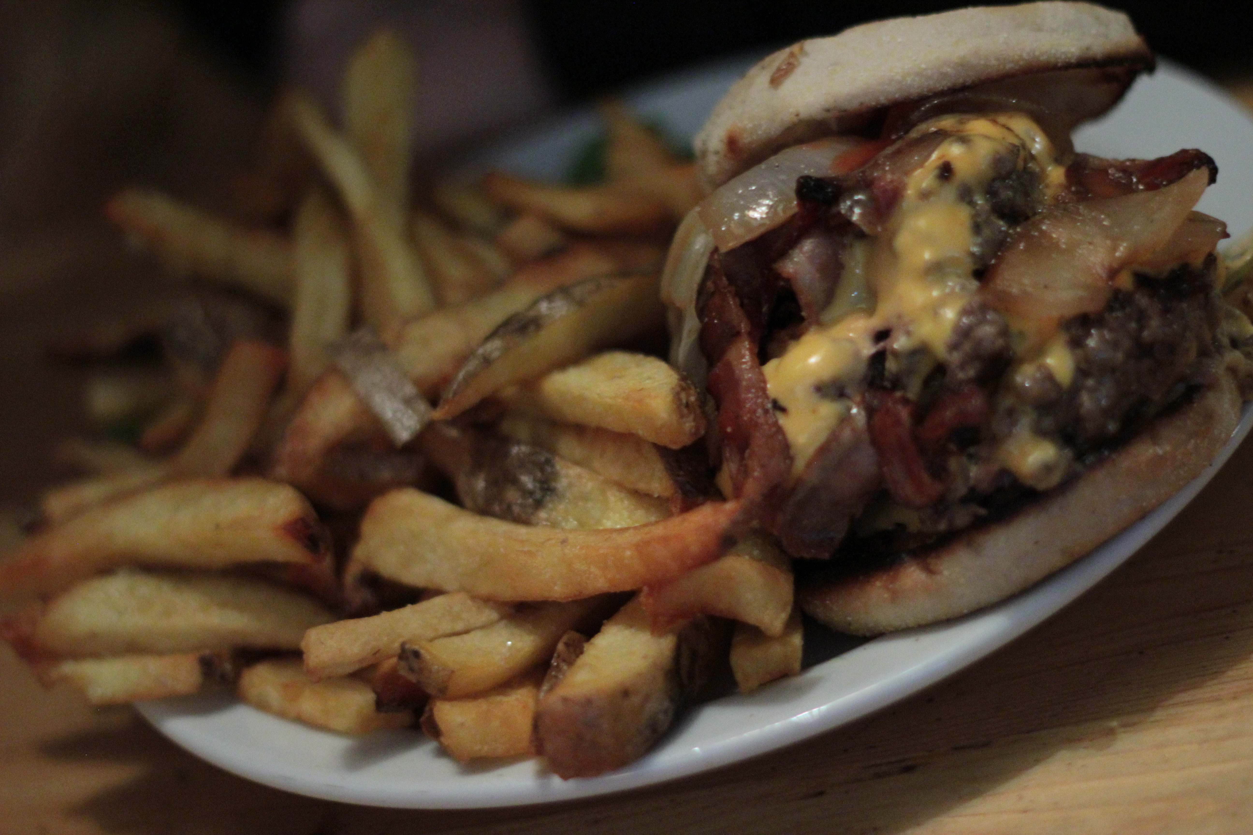 ‘Da Woiks’ burger consisted of a beef patty topped with American cheese, bacon, onion and mushrooms. The patty was cooked medium as requested and much like our first burger, was incredibly juicy. The bacon was crisp and delicious and the mushrooms; which we weren’t sure about initially, actually complimented the rich beef very well. Much like the Birdhouse burger; however, the main issue here was with the muffin bun, which after a few bites was rendered irrelevant due to it being so small and, well….not a proper burger bun.