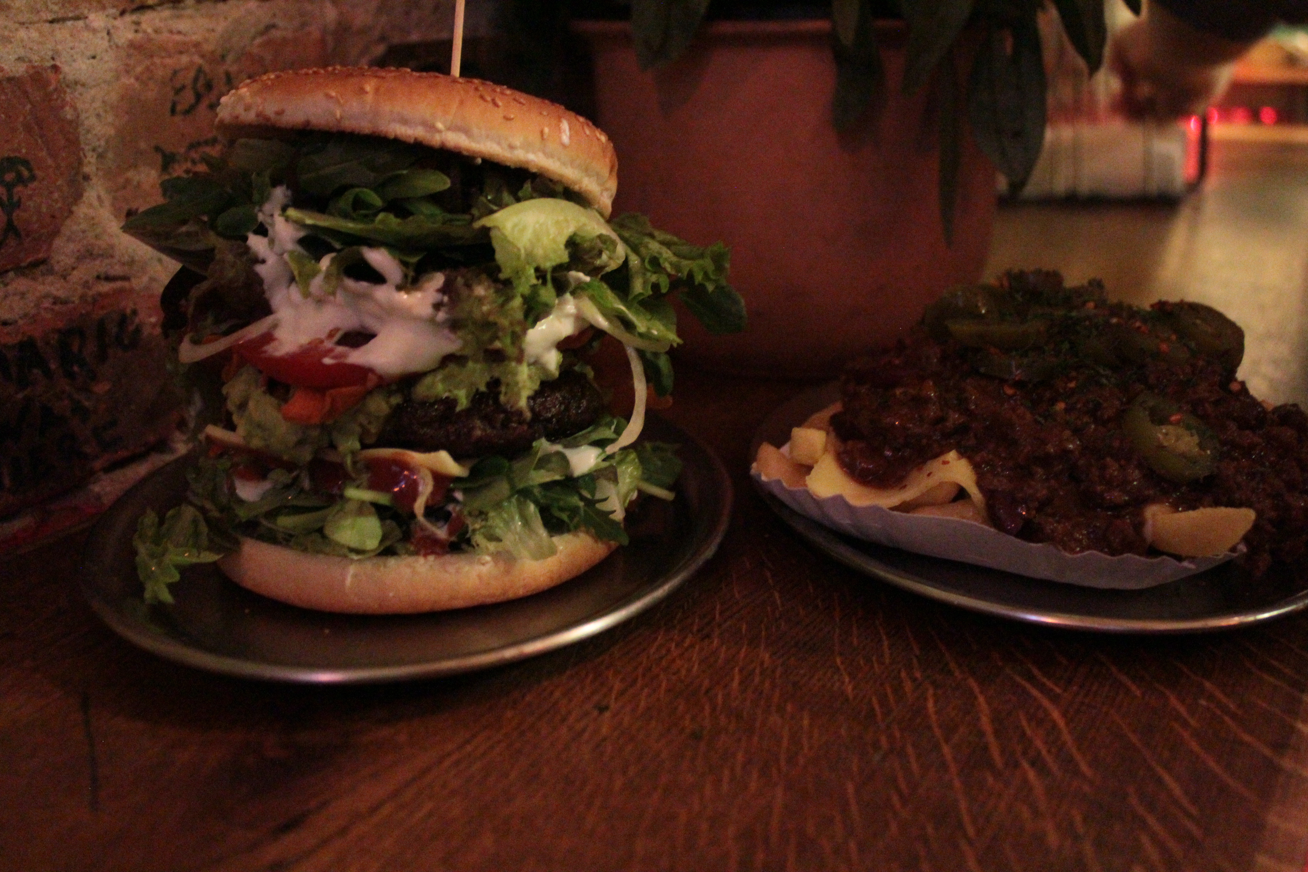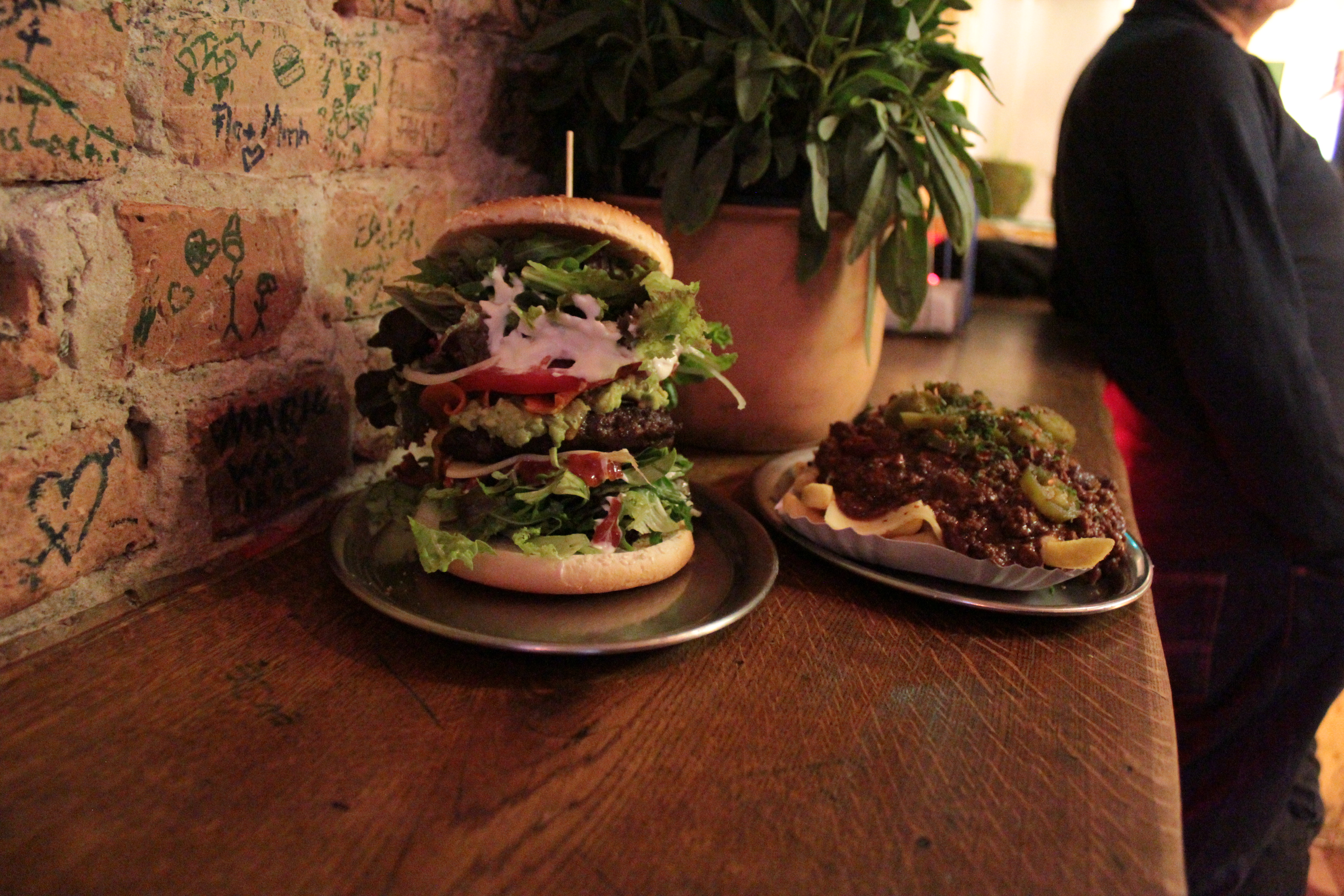 The Berlin Burger International (BBI) process is a fairly simple one. Turn up, queue, order, pay, hope to the burger gods that you can find somewhere to lean or sit and wait for your name to be called. After queueing for around ten minutes, we decided to order the special, highlighted in the photo below. The ‘El Gordonita’ burger consisted of a beef patty topped with salad, sweet potato shavings, guacamole, cheese and sour cream.