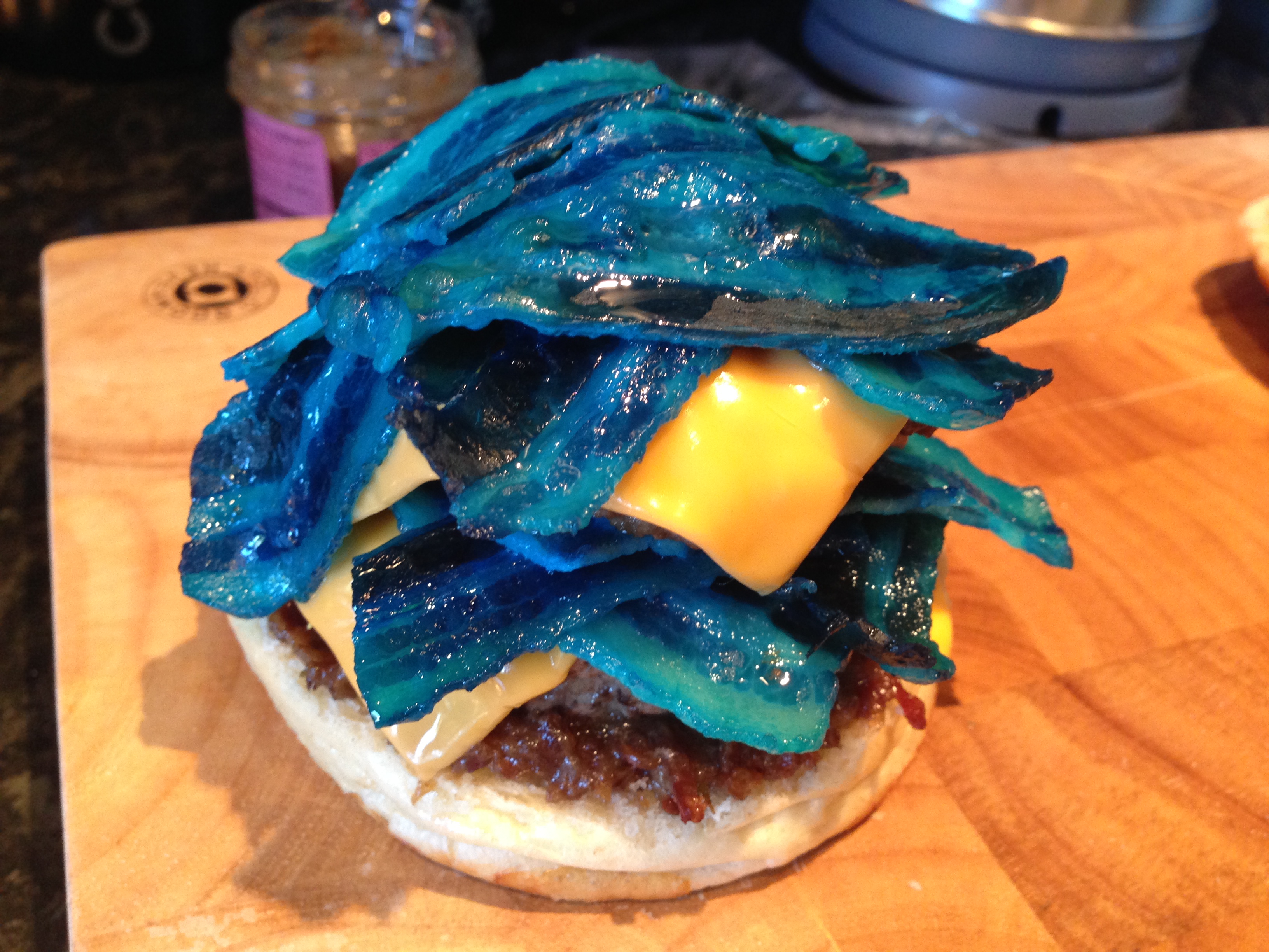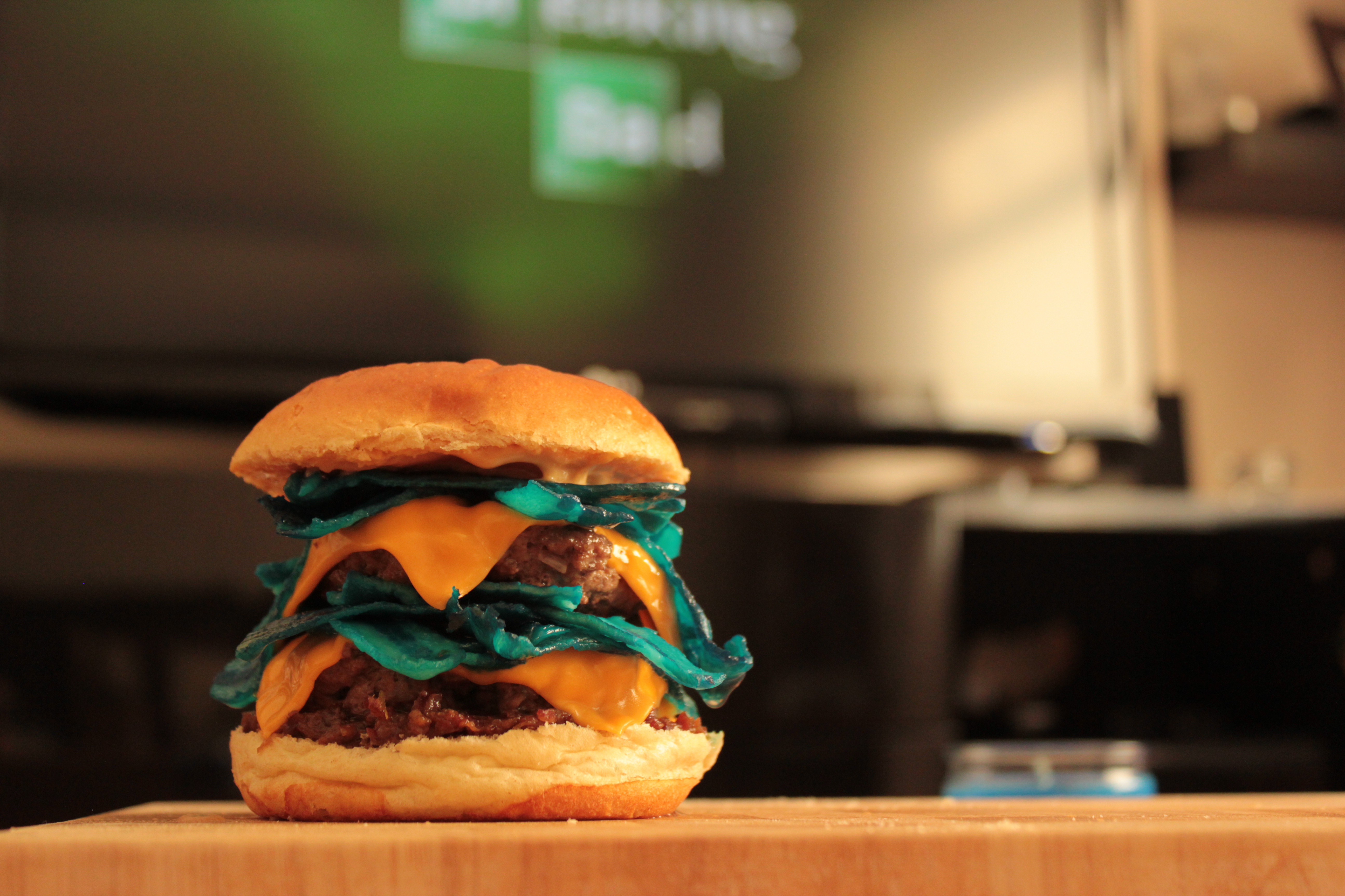 Like most of you, we love Breaking Bad. Quite simply, it’s the greatest television show ever made and we’re both excited and sad that it’s all coming to an end. To celebrate the finale of the most gripping piece of television ever to grace our screens, we decided that a tribute cook was the right thing to do and it was Pamela, our resident photographer, who came up with our very own Breaking Bad ‘Heisenburger’ with ‘blue-meth’ bacon**.