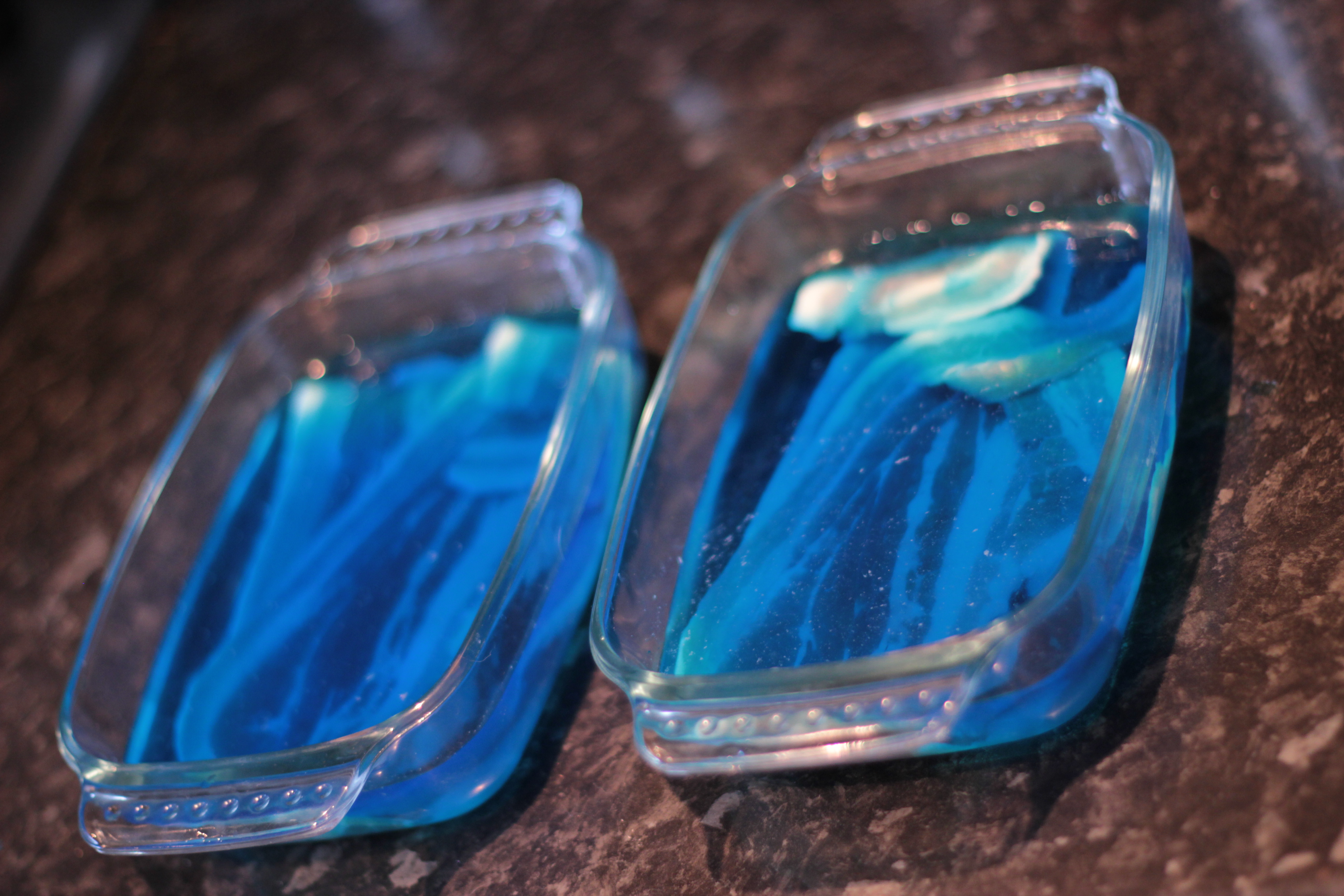 – Fill 2 small baking dishes (or any other container you have) with cold water and add a teaspoon of blue food colouring