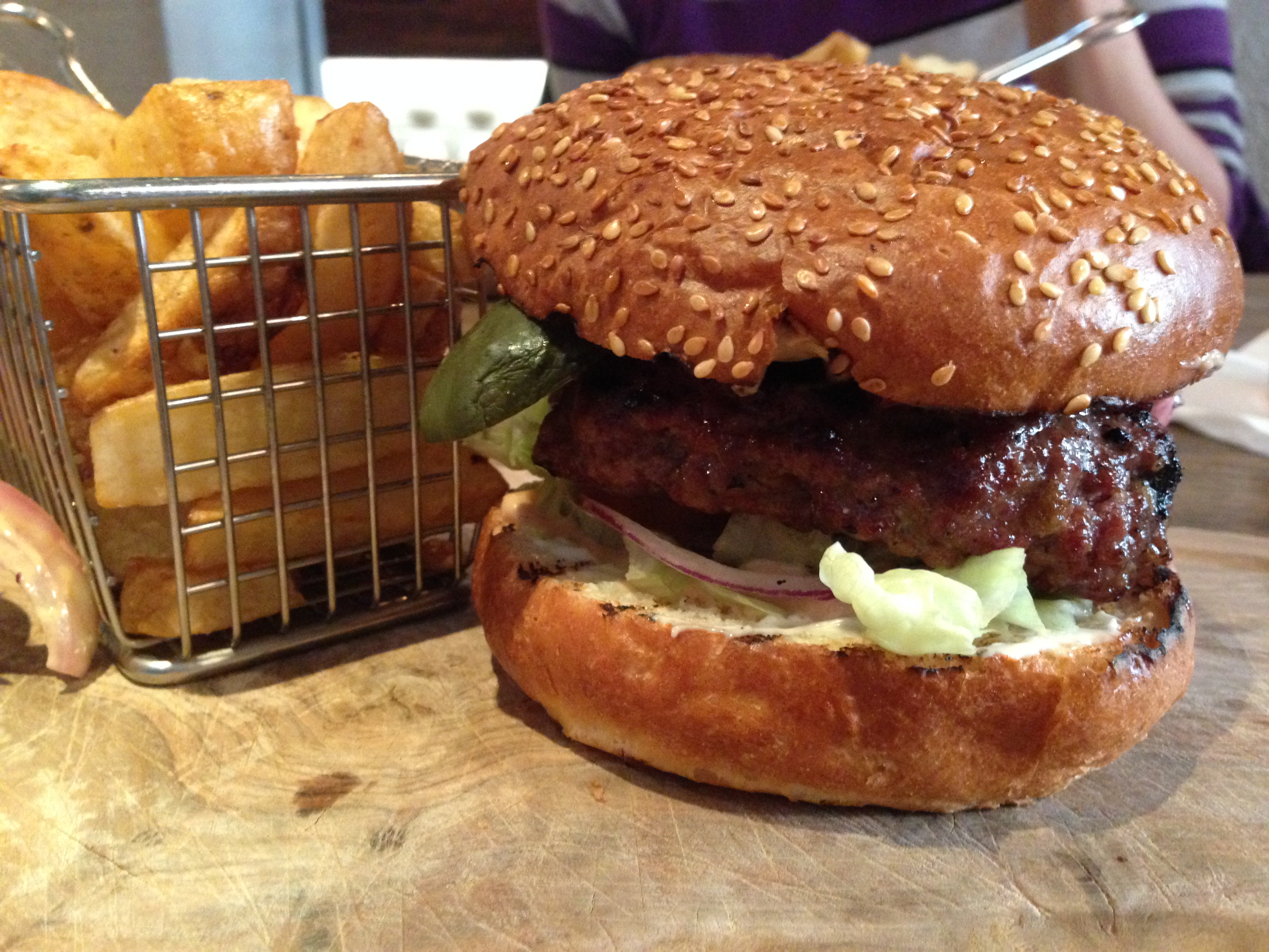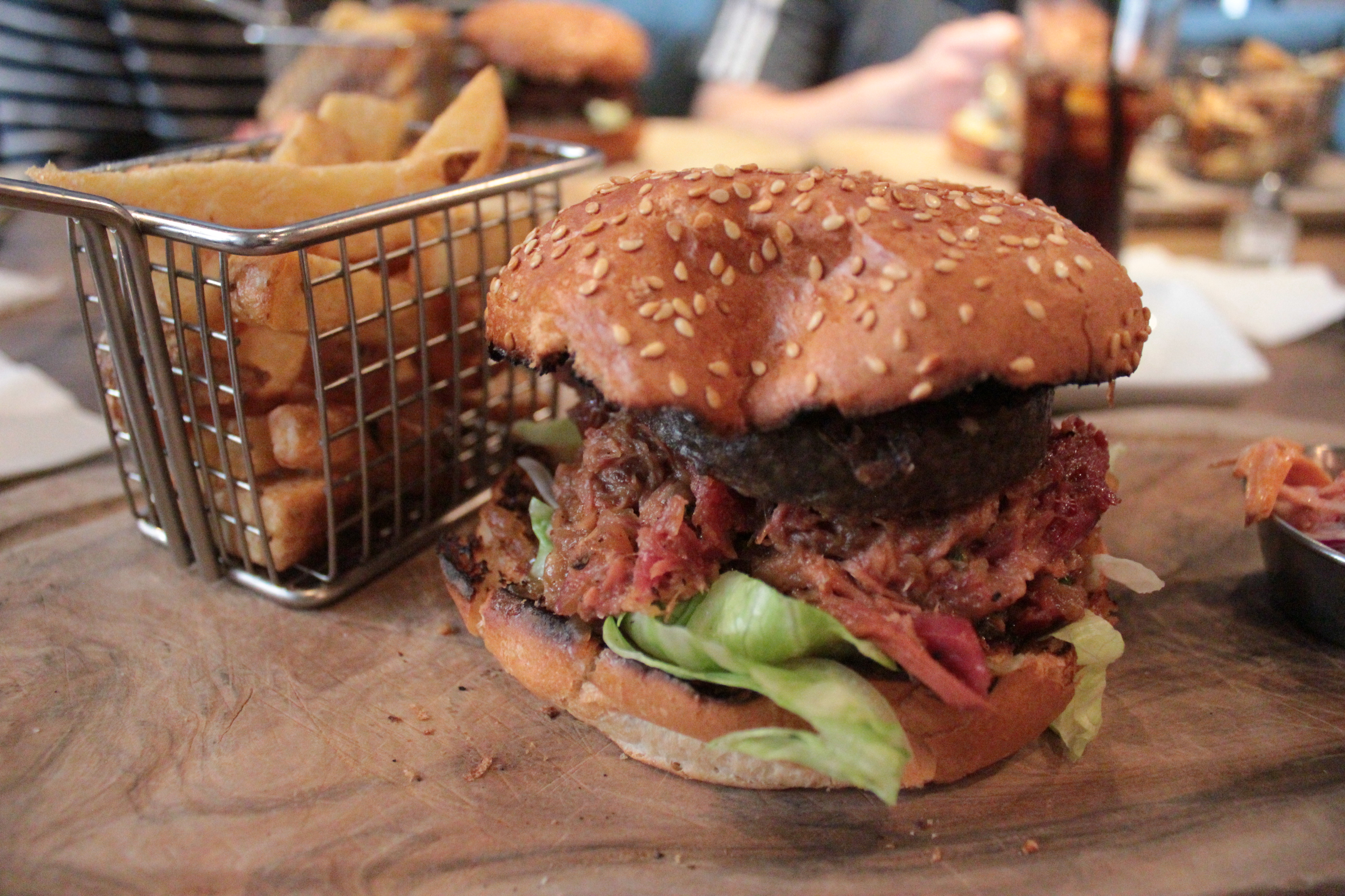 The Sloppy Swine was presented in the same way as the New Yorker – on a wooden serving board with fries.