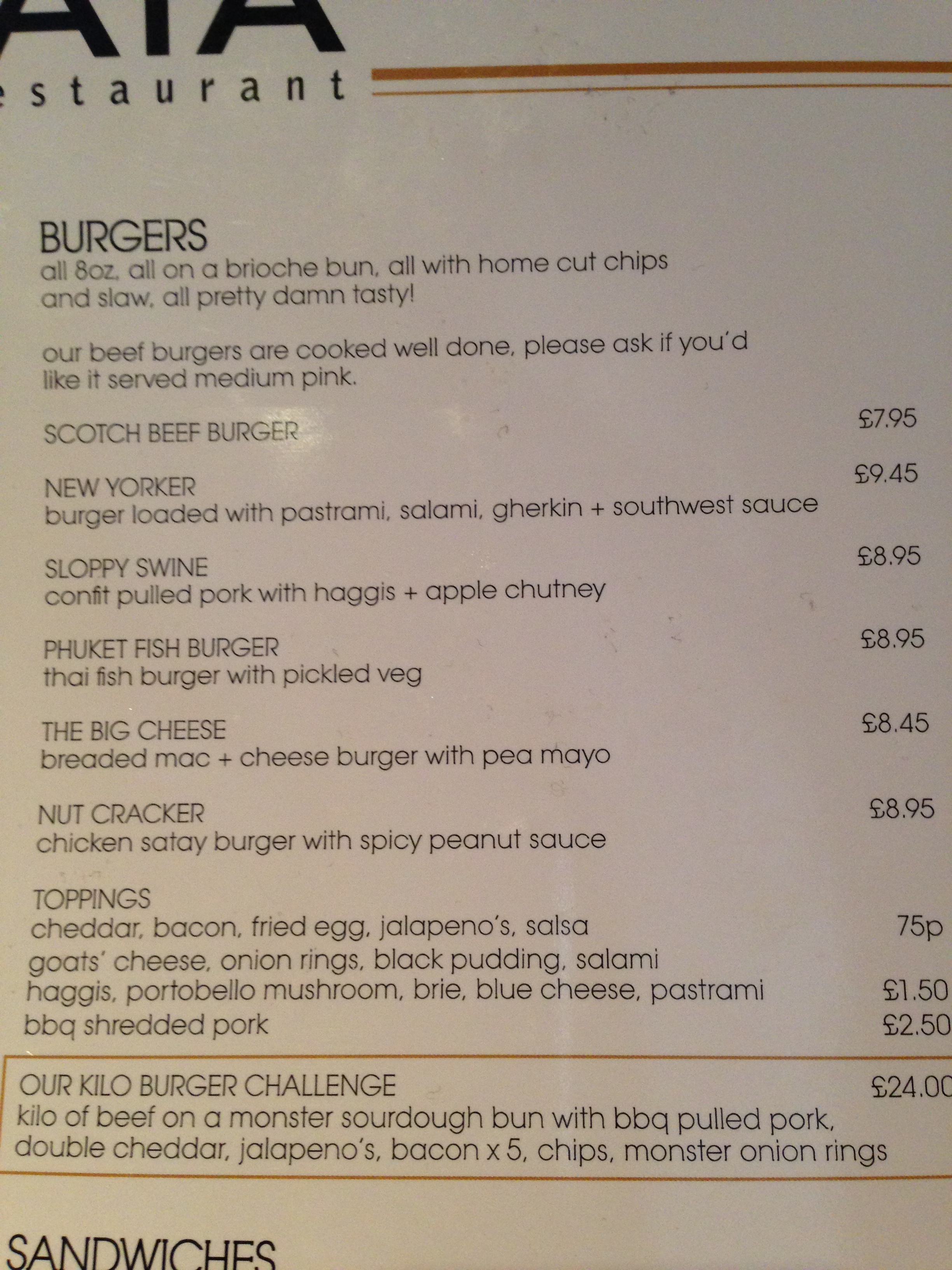 My first visit to Strata was many years ago, on a random and rainy Saturday afternoon in Glasgow. Quite frankly, I hated it. Overpriced, poor quality pub food that you’d expect to find out of a box from a supermarket. At the time, I thought I’d never go back again. Recently; however, at Glasgow’s 2013 ‘burger-off’, Strata had entered one of their burgers into the competition. Despite my reservations based on my previous pre-JVB experience, I thought that it was one of the best burgers entered into the competition. At the time, I was sure that there was no way such a delicious burger could have came from the same place that I had such a bad experience in a few years earlier. I later heard rumblings that in the past couple of years, Strata had gone through several menu and management changes. With that in mind and based on the burger I sampled at the competition, I decided that it was time to go back – this time, for a burger.