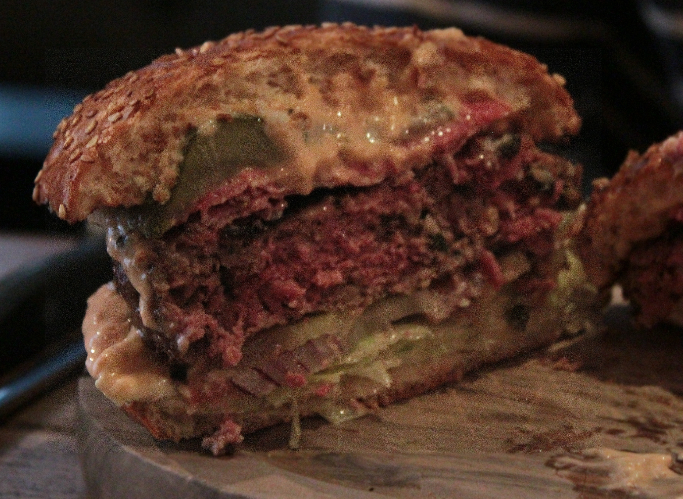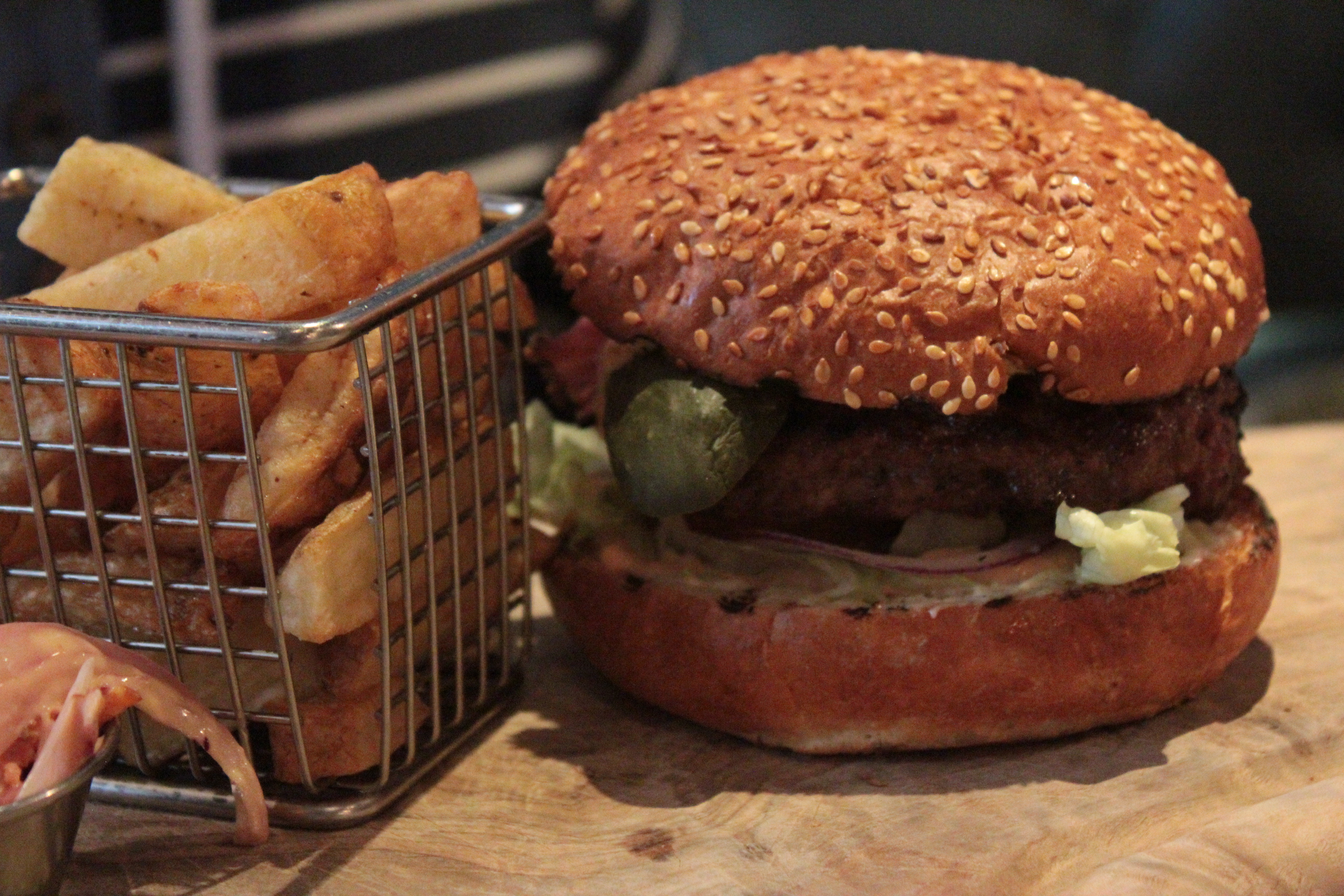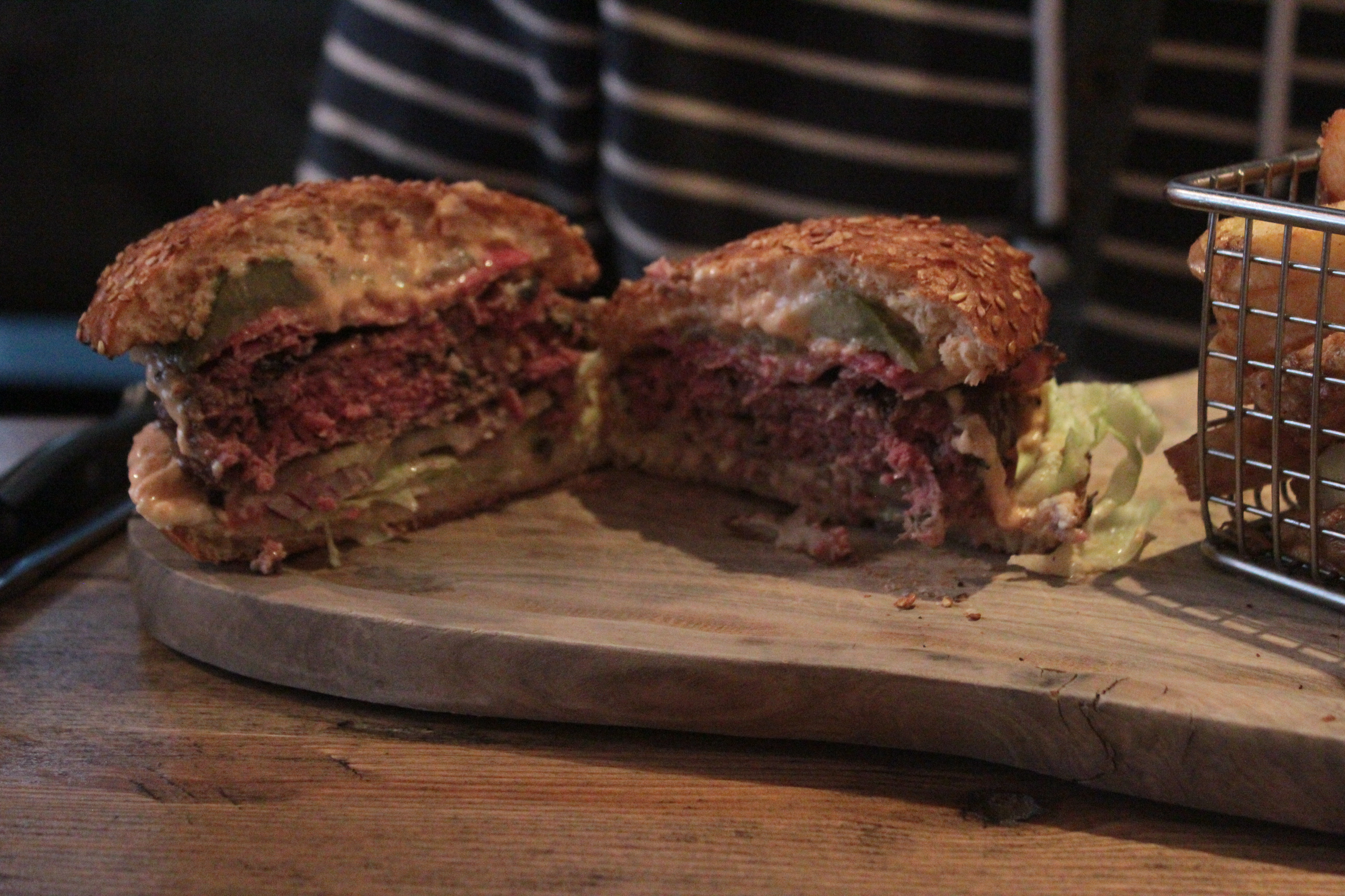 Presentation-wise, the New Yorker looked pretty decent. Everything was housed nicely inside the bun and there were no signs of anything spilling out over the sides. The bun appeared nicely toasted and the whole thing was presented on a heavy wooden board with a mini basket of fries on the side.