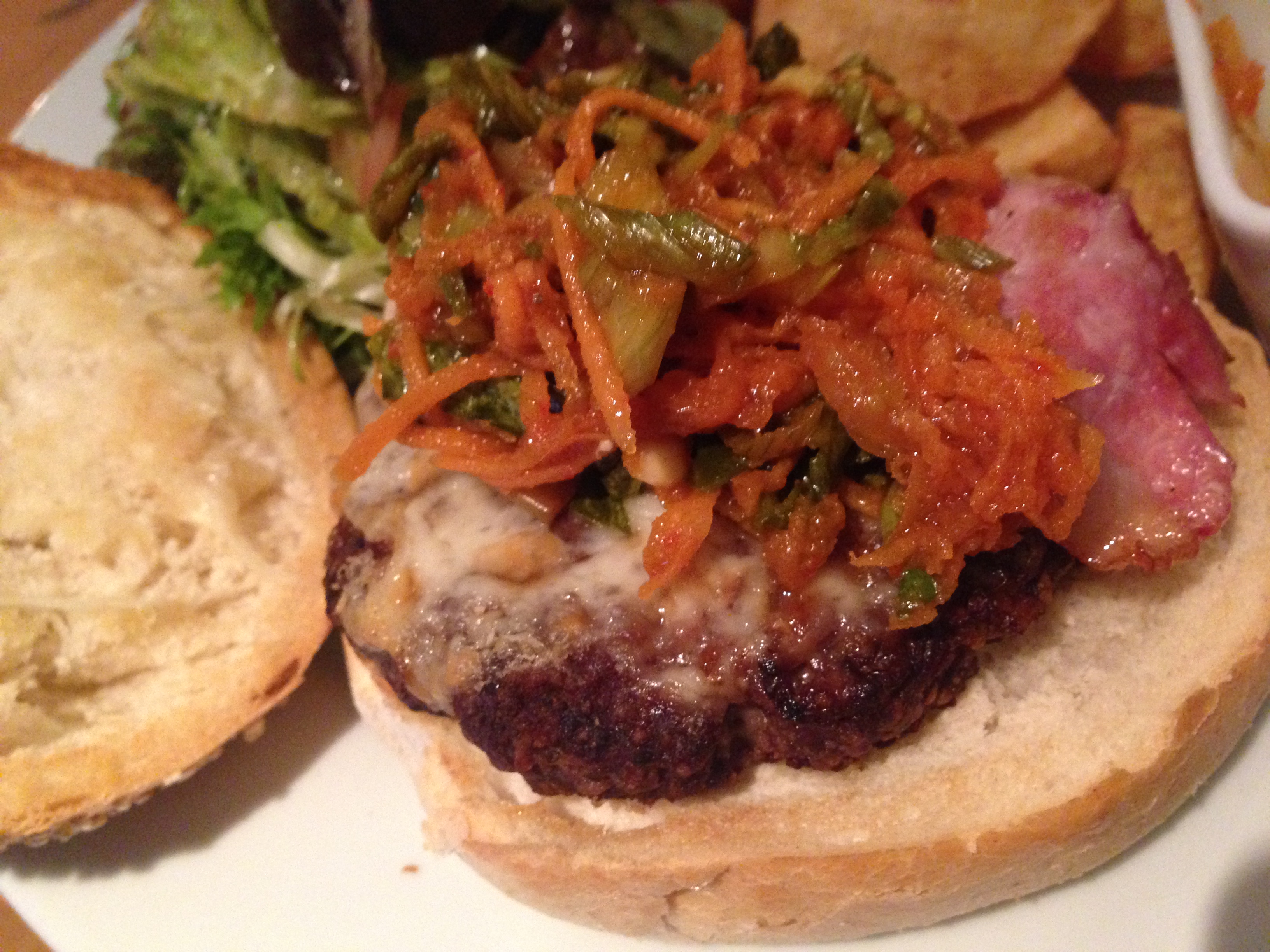 The burger came topped with cheese and bacon and with the kimchi served on the side. I put the kimchi on the burger and took a bite, but the beautifully delicious kimchi was overshadowed by just how awful the beef patty was. After tasting the delicious Nasi goreng and knowing the reputation that Stravaigin has for excellent food, I was fairly shocked at how overcooked the burger was. It wasn’t that it was even just a little crispy on the outside, it was flat-out nuked to a crisp. The meat had quite a strong, peppery kick and actually reminded me of an over-cooked lorne sausage rather than a burger.