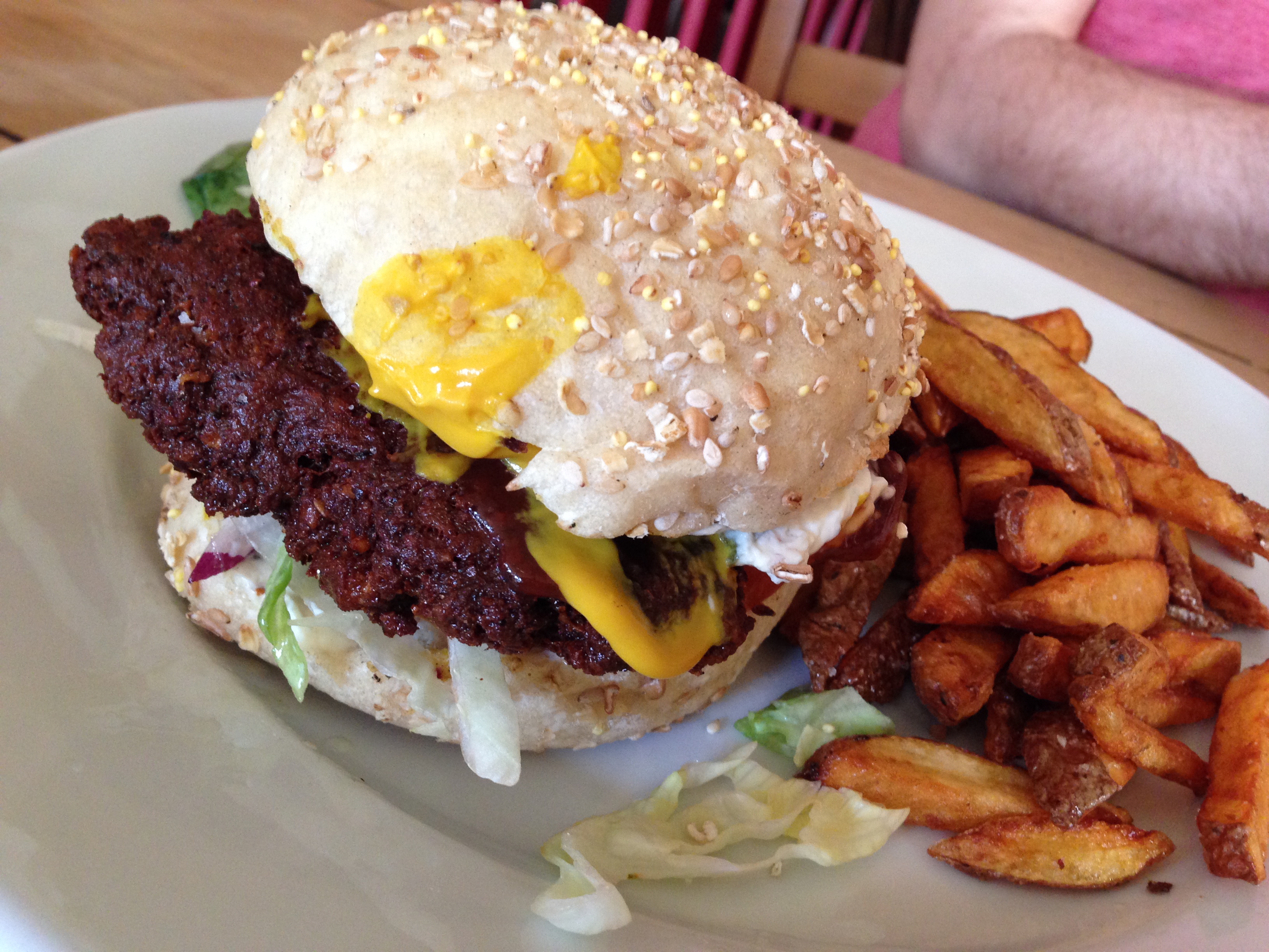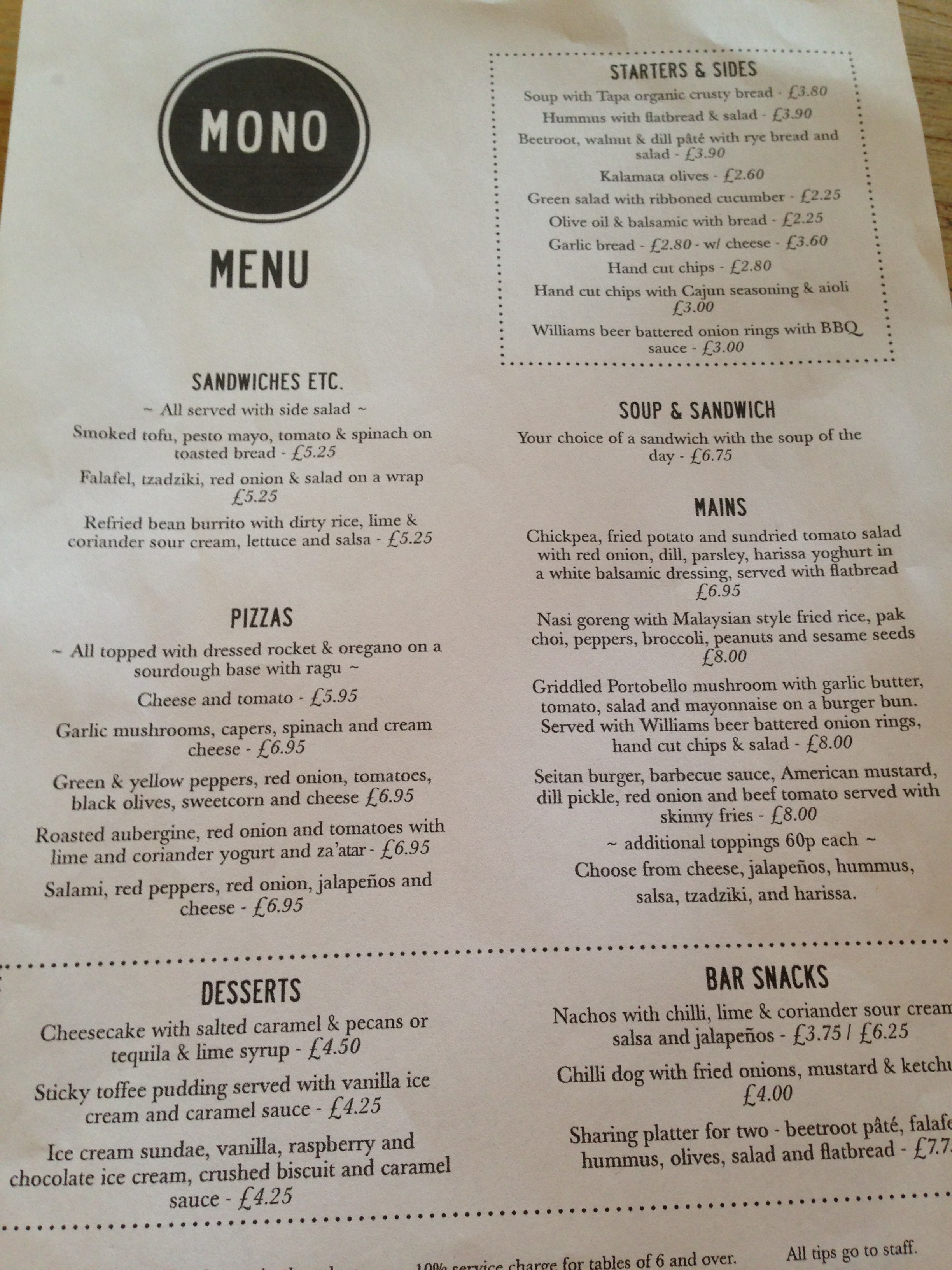 If you’re not aware, seitan is a high-protein product, which is usually made of wheat flour, spelt flour or gluten. Seitan has a slightly chewy, stringy texture, making it a popular meat substitute among vegetarians and vegans. It’s often used instead of meat in Asian cuisines too. It’s not something that’s widely available in UK shops, unless you go to your nearest chinese supermarket or specialist health shop. Reading Mono’s menu, I was intrigued to find a seitan burger on there and it certainly made a nice change from the usual chikpea and bean burger. There’s nothing wrong with a good chikpea, bean and carrot veggie burger, but it’s nice to have a bit of meat-free variety too.