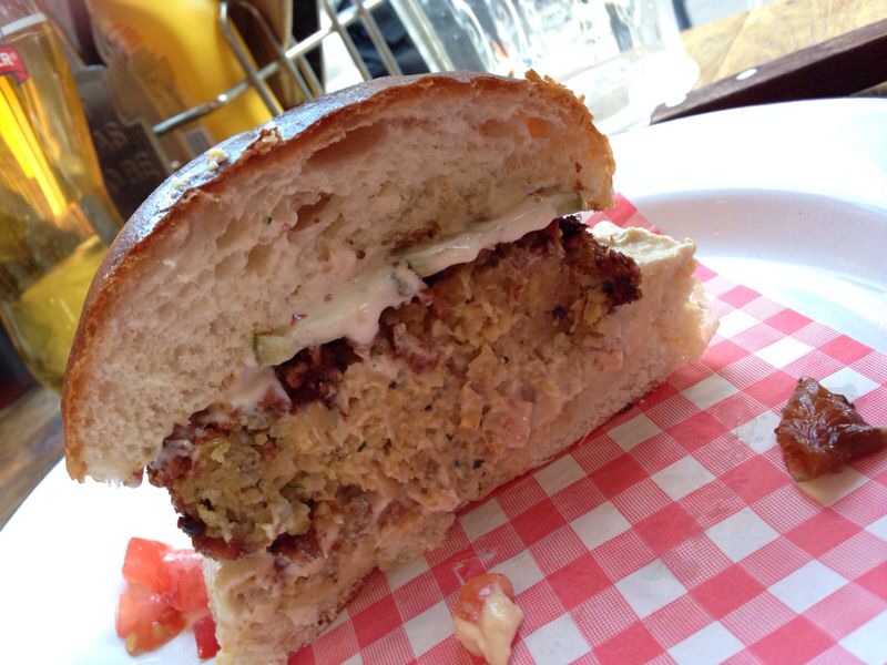 The first thing that hits you when eating this burger is the awesome crispy crumb coating that surrounds the falafel. It’s herby, light and helps keep everything in perfect burger form. If you’re worried about falafel falling apart and out of the bun, don’t be. In fact, I was able to cut this in half with no issues and it remained mess-free throughout.